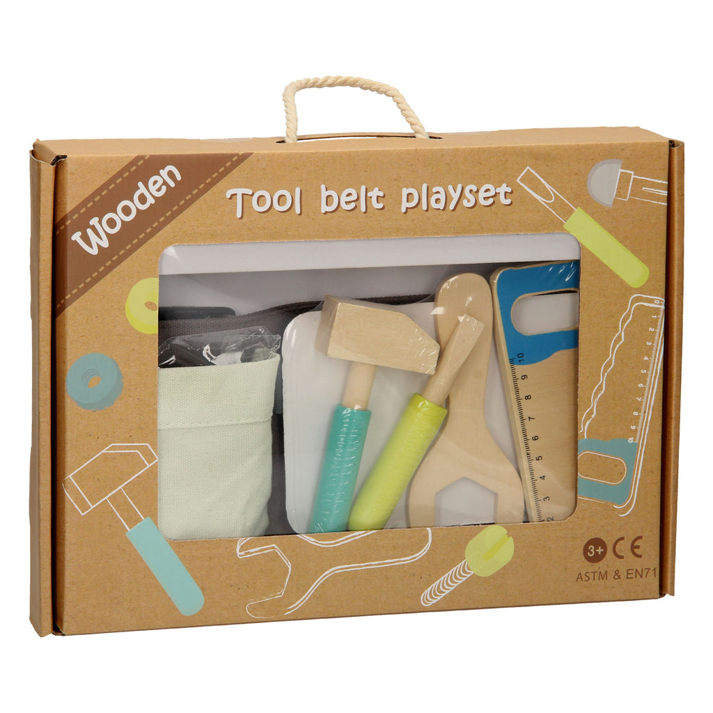 Houten gereedschapsset inclusief gereedschapsriem. Inclusief: 3 bouten en moeren, hamer, moersleutel, schroevendraaier en zaag.