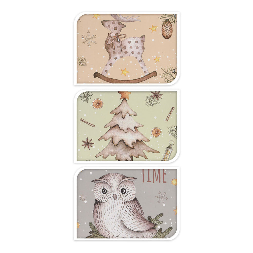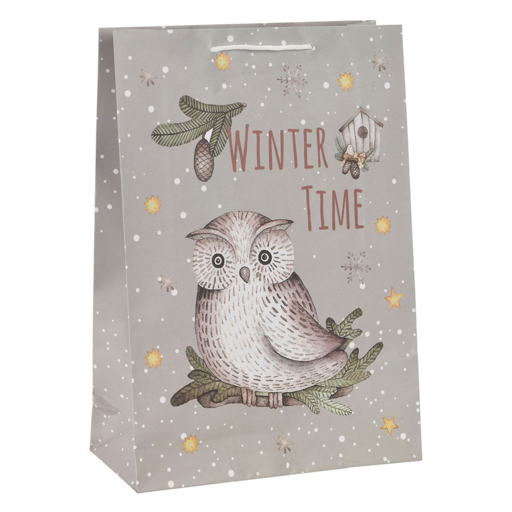 Set van 24 knusse geschenktasjes met winterthema in drie rustieke illustraties: uil, hert en kerstboom. De geschenktasjes zijn 23 centimeter groot en hebben een sluitkoord bovenaan.