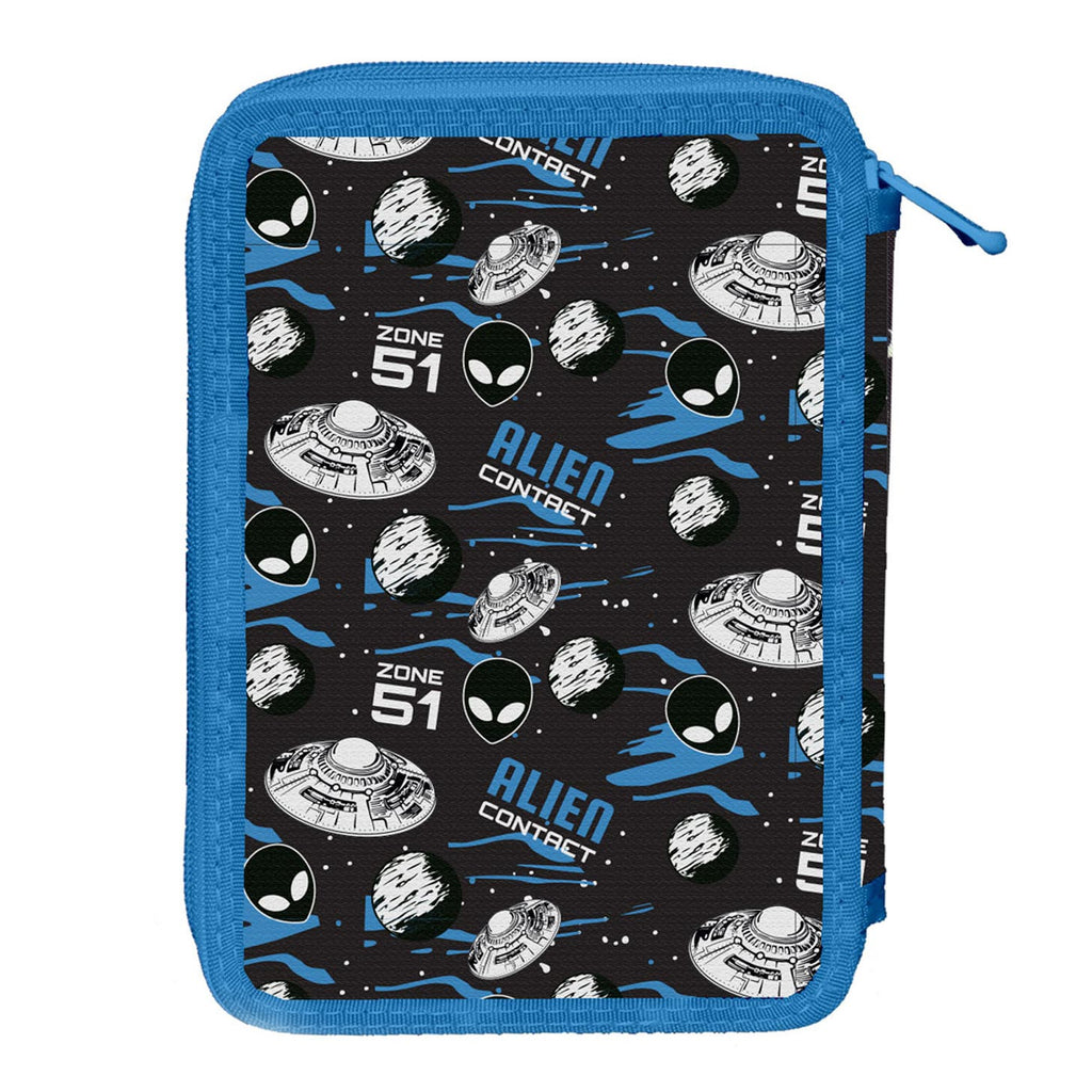 Gevuld etui met potloden, een pen, liniaal etc. in alienthema. Kleur: blauw/zwart, gemaakt van polyester. Adviesleeftijd: vanaf 6 jaar.