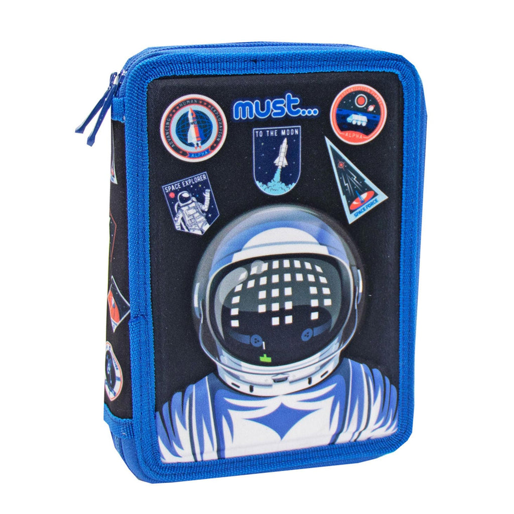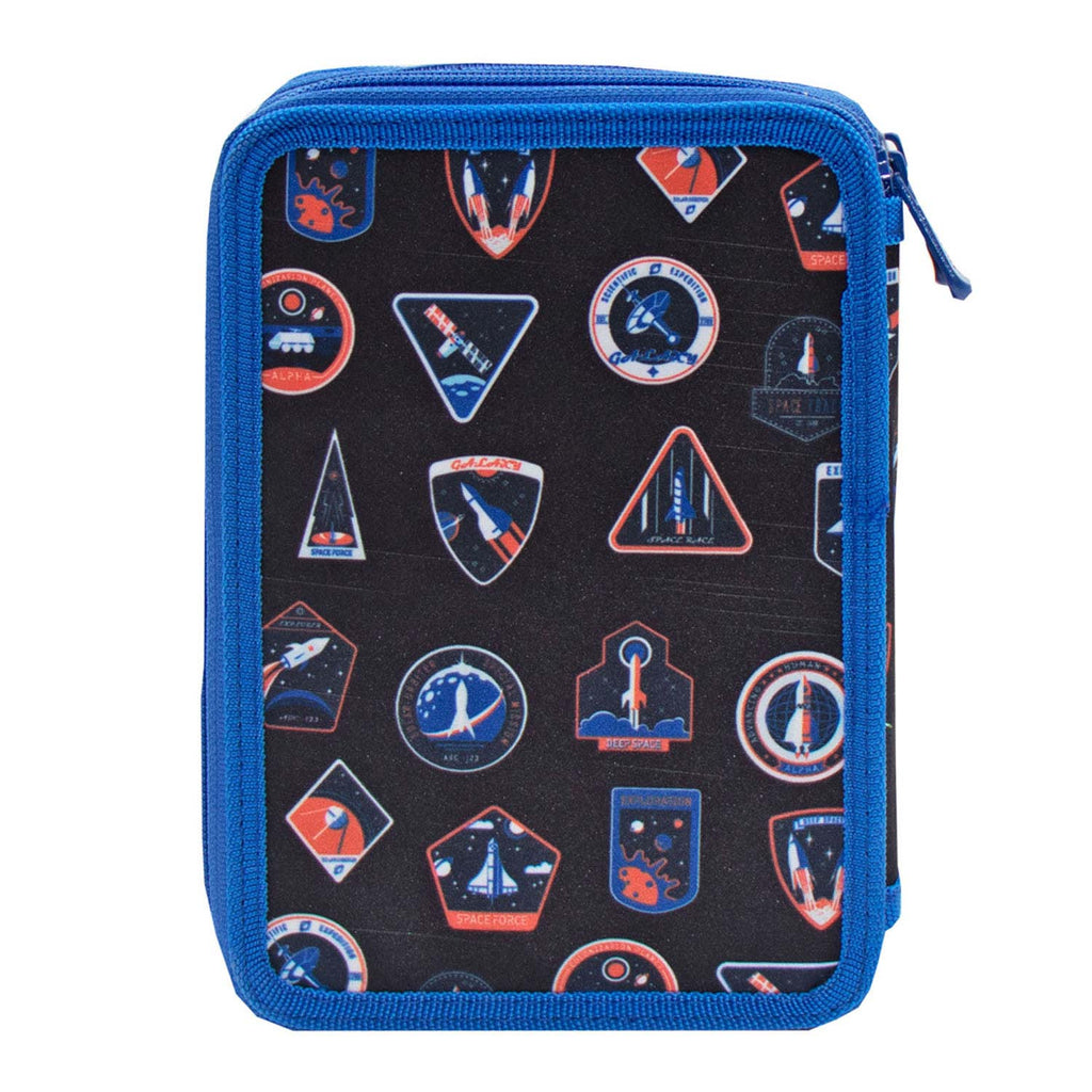 Handige gevulde etui met Astronaut opdruk, vol met leuke en handige accessoires, zoals stiften, pennen, potloden, een gum, een liniaal, een geodriehoek en een stencil met cijfers.