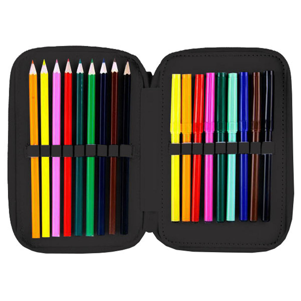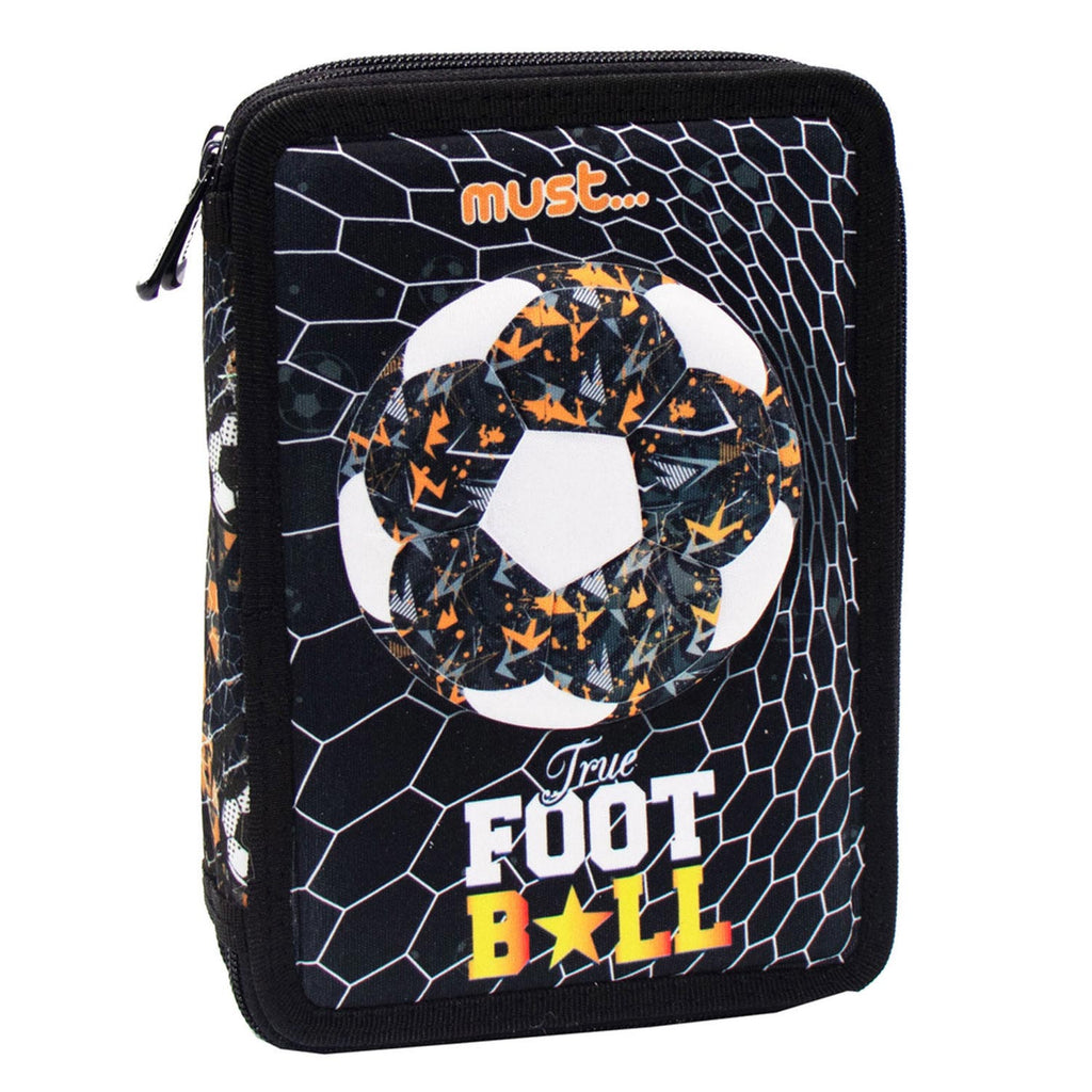 Handige gevulde etui met Voetbal opdruk, vol met leuke en handige accessoires, zoals stiften, pennen, potloden, een gum, een liniaal, een geodriehoek en een stencil met cijfers.