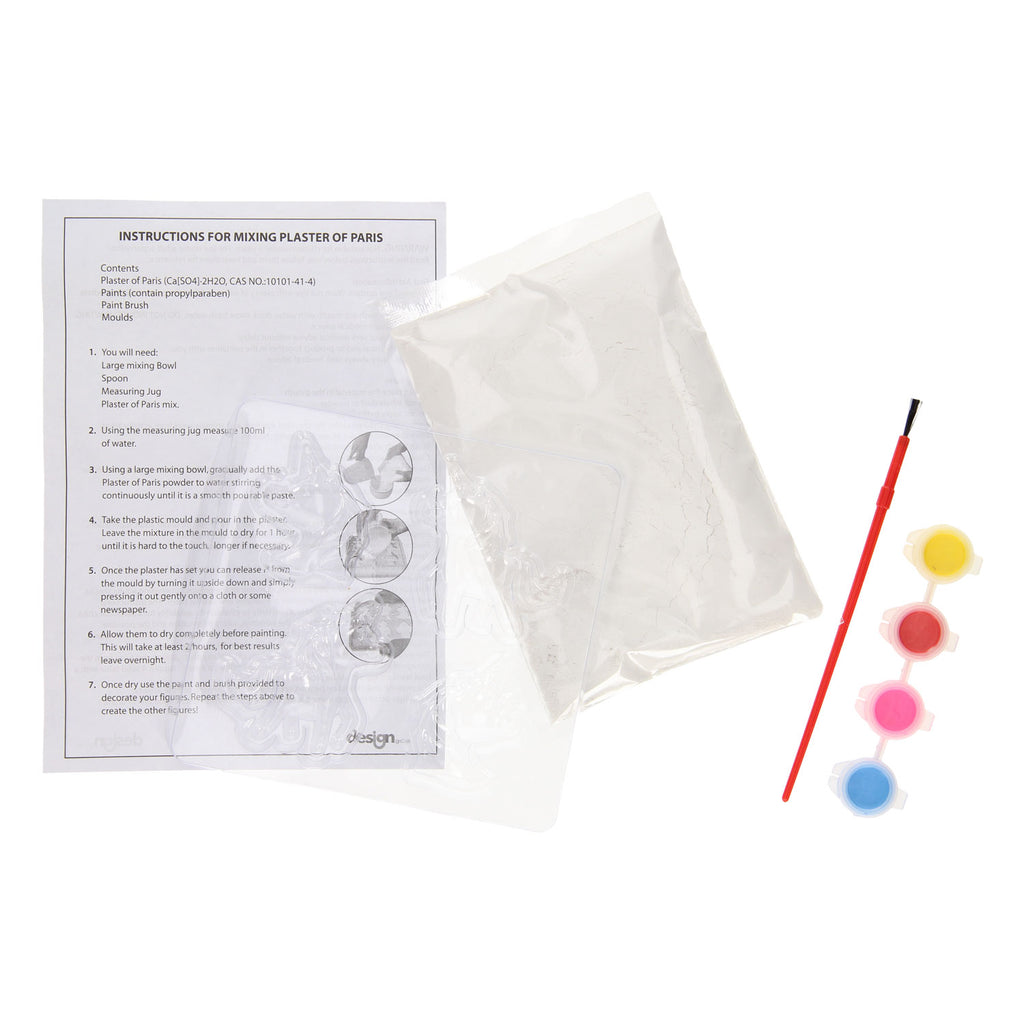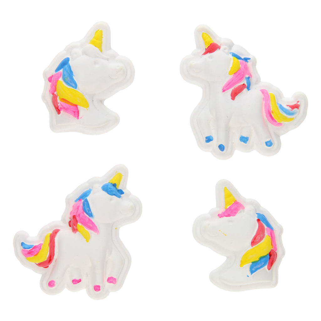 Gieten en Schilderen Eenhoorns. De set bestaat uit gips, vier potjes verf, een kwast en vier eenhoorn mallen. Geschikt vanaf 5 jaar.