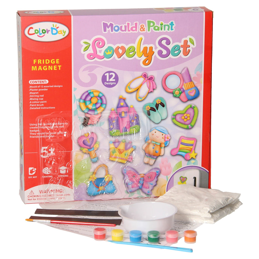 Met dit DIY-pakket maak je zelf je gips, alle ingrediënten zijn aanwezig in de doos! Er zijn 12 vormen om uit te kiezen, bijvoorbeeld een lolly, een kasteel of een kroon. Als het gips is uitgehard, kun je deze verven in de kleuren zoals jij zelf wilt! Met een magneetje kun je jouw creatie op de koelkast bevestigen. Inhoud: gips, mengbakje, mal met 12 designs, boetseergereedschap, 6 kleuren verf (rood, geel, blauw, groen, roze, paars) en een penseel.