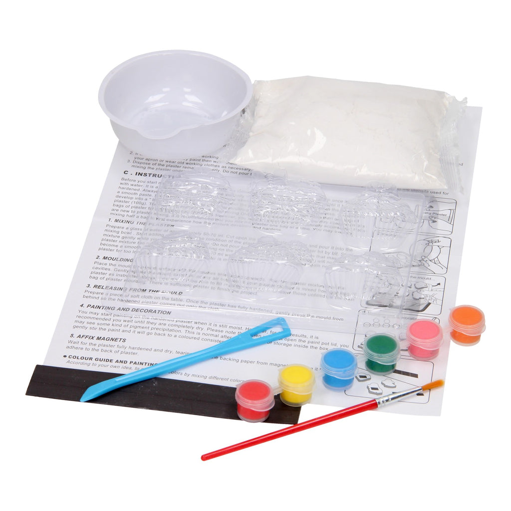 Met deze gipsen knutselset maak je je eigen gipsen magneten in vorm van cupcakes. Als de cupcakes droog zijn kun je het gips beschilderen met verf. De set bevat gips, zes vormpjes, zes kleuren verf en een kwastje. Ook zitten er magneetstrips bij zodat je ze op de koelkast of een whiteboard kunt plakken. Incl. instructies. Geschikt vanaf 5 jaar.