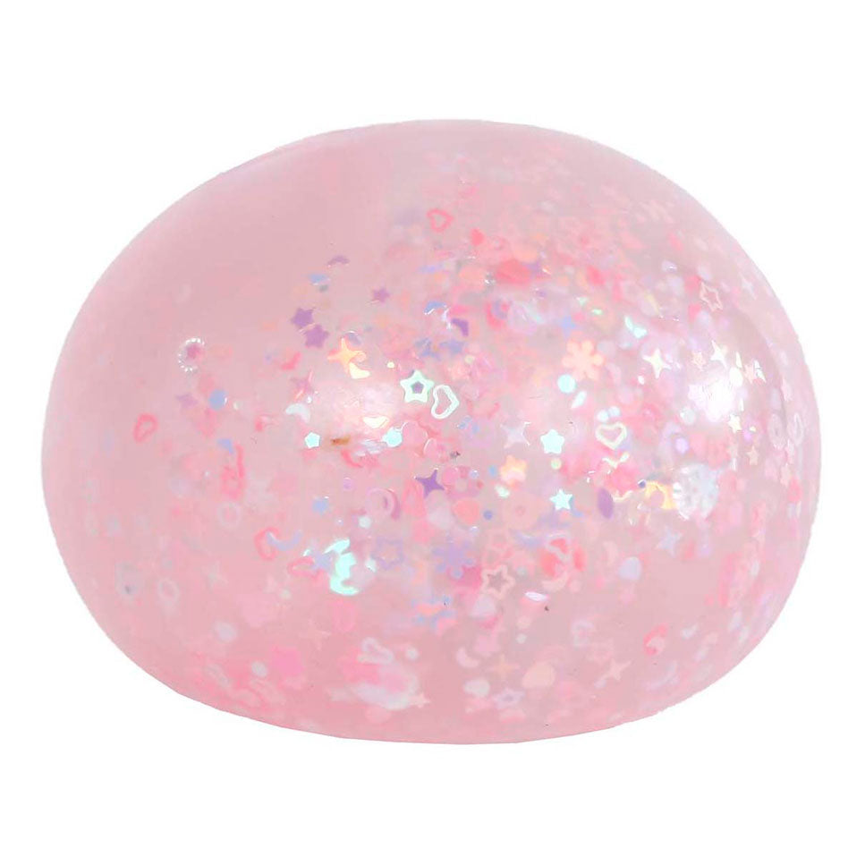 Glamour Mega Squeeze knijpbal met roze bloemen en glitters, 9 cm. Geschikt voor kinderen vanaf 3 jaar oud.