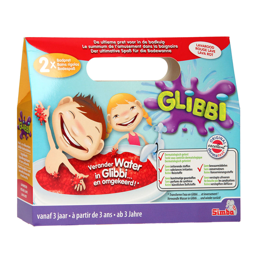 Glibbi is de gloednieuwe bad sensatie het verandert het badwater in een andere kleur! Vul het bad met 30 liter water en voeg het gekleurde poeder toe. Het water verandert in een kleurrijke en slijmerige massa! Om het effect ongedaan te maken voeg je nog is 30 liter water en het speciale zakje Glibbi oplosser toe. Binnen 5 tot 10 minuten lost het op naar gekleurd badwater. Deze set bevat 2 x 150 gram Glibbi poeder en 2 x 150 gram Glibbi oplosser een een gebruiksaanwijzing.
