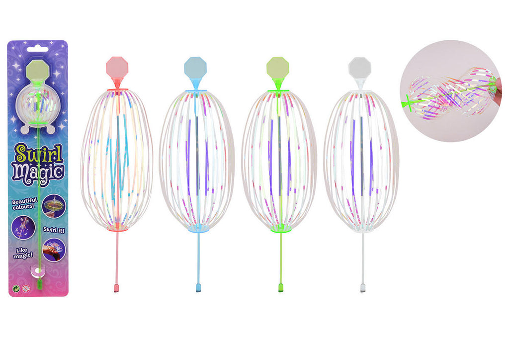 Toverstaf die kan draaien, met gekleurde glitter staafjes. De toverstaf is 8,5 bij 6 bij 36 centimeter groot.