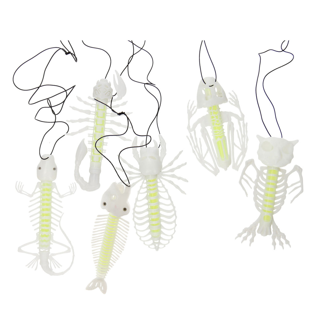 Steel de show met deze toffe Glow in the Dark Skelet. Het skelet geeft licht in het donker en is door het bijgeleverde touwtje te gebruiken als een hippe ketting. In de verpakking zit 1 glow stick, een dierenskelet en een zwart touwtje.