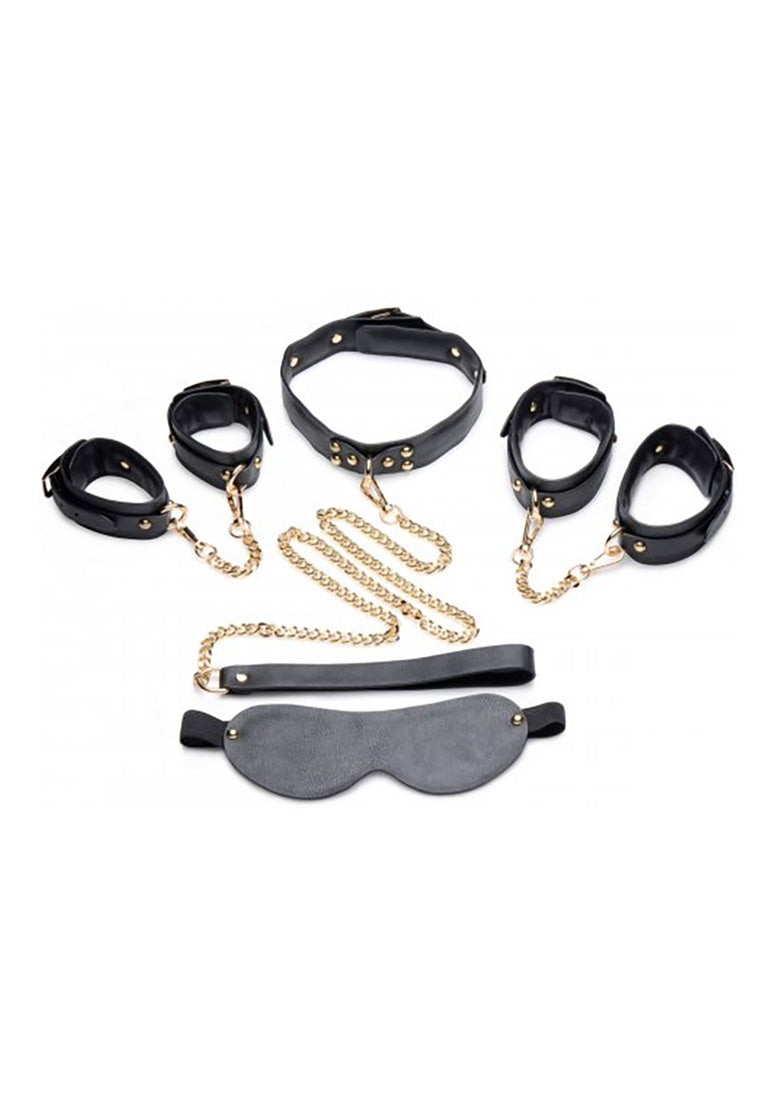 Includes: Blindfold, wrist cuffs, ankle cuffs, and collar with leash