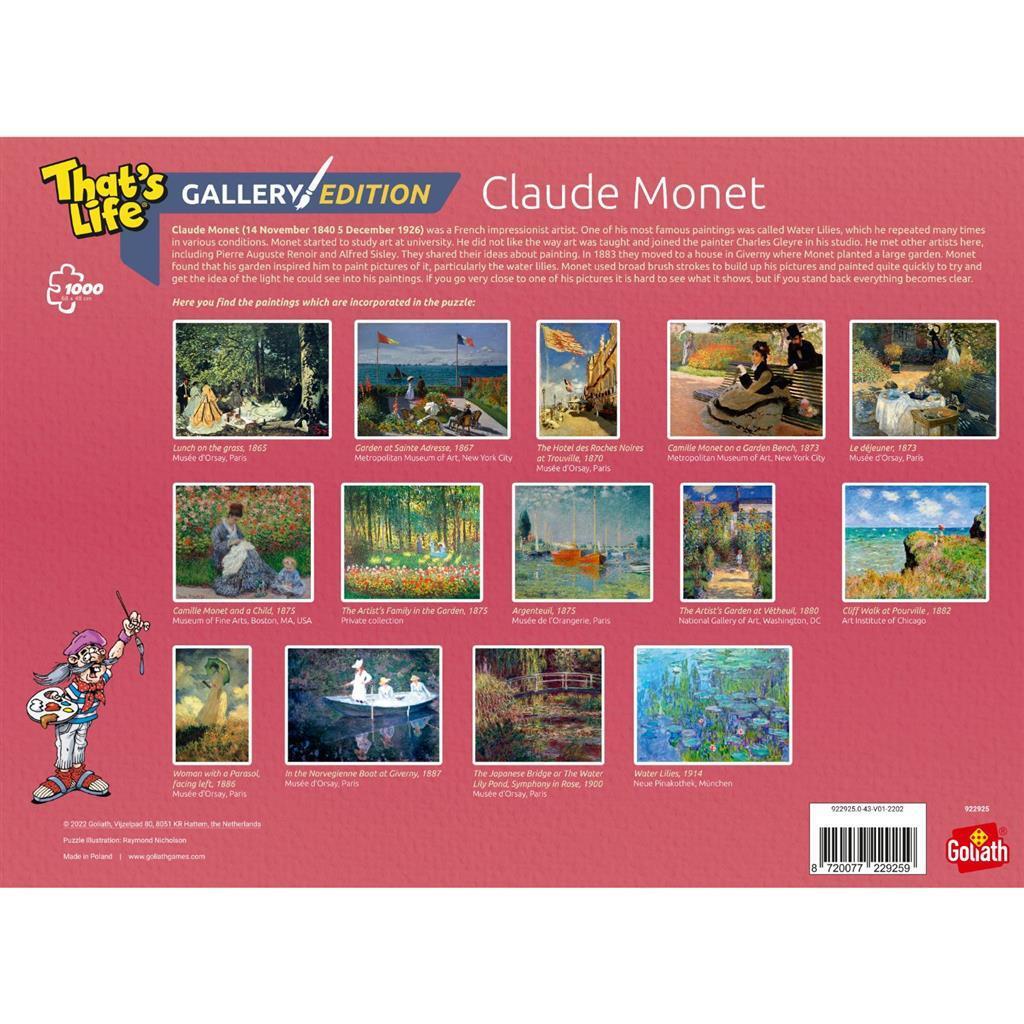 Legpuzzel van 1000 stukjes. De prent toont een chaotische scène in een tuin, met personages, thema'sen schilderijen van Monet. Geschikt voor kinderen vanaf 12 jaar.