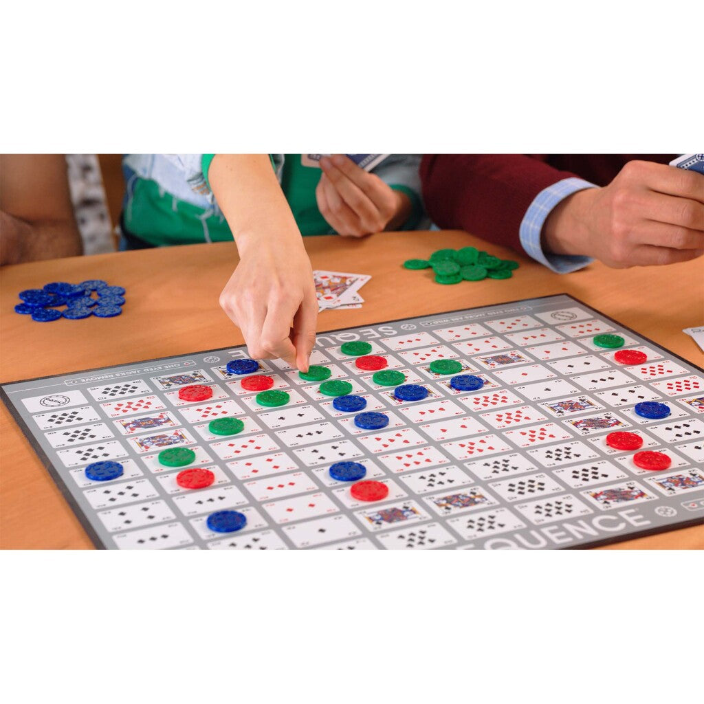 Goliath Sequence Originalis een leuk kaartspel voor 2 tot 12 spelers waarin je je tegenstanders te slim af moet zijn en als eerste twee rijen van vijf fiches van dezelfde kleur op het speelbord te krijgen! Een must-have voor de spelletjeskast volgens fanatieke spelers! Pas op! Zodra je begint met spelen wil je niet meer ophouden met dit bordspel. In Sequence speel je elke beurt een kaart en plaats je een fiche op het juiste vak op het bord. Hierbij moet je tactisch te werk gaan en hoef je niet elke keer aansluitend neer te leggen. Het is de bedoeling om uiteindelijk 2 rijen van 5 fiches op het speelbord te krijgen. Die rijen mogen horizontaal, verticaal en diagonaal neergelegd worden. Eén van de spelelementen van Sequence is het dwarsbomen van je tegenstanders. Probeer met jouw kaarten de rijen van de tegenstanders tegen te houden.