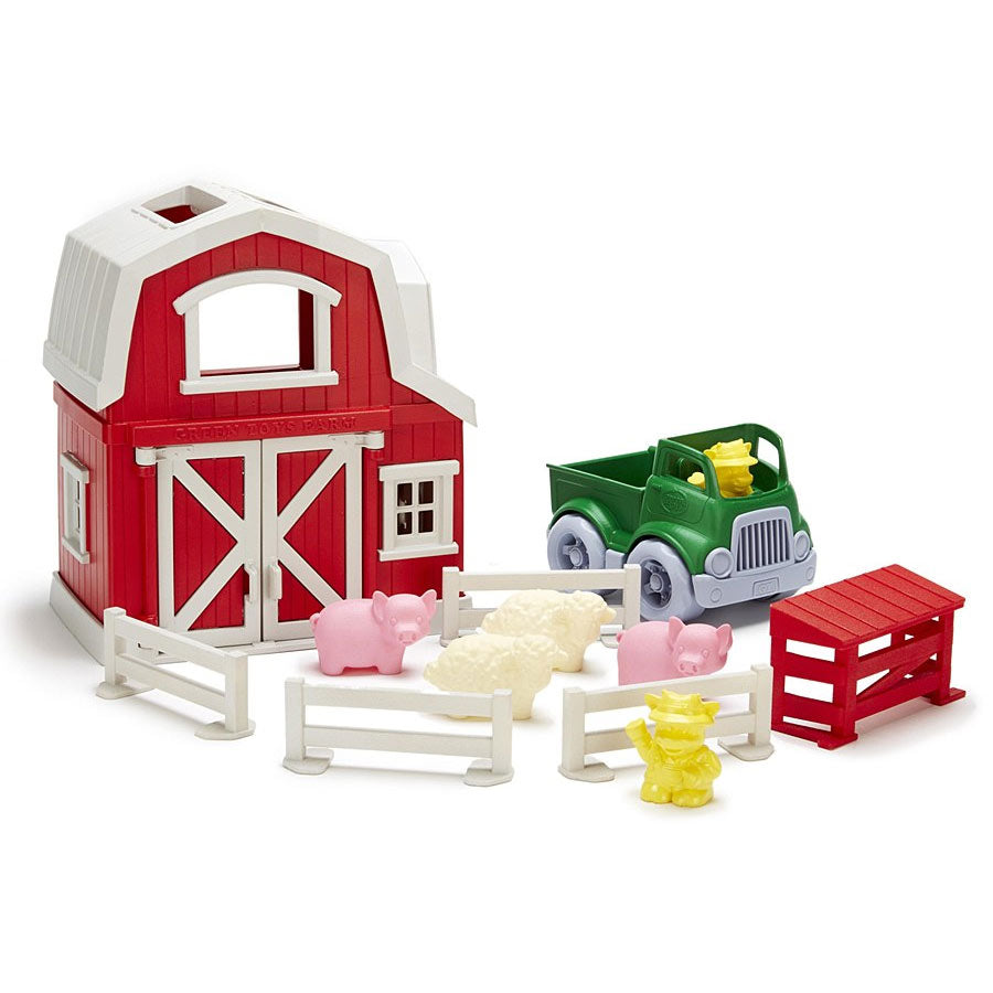 Het leven op het boerenland is heerlijk, dat laten de 2 boeren koeien zien. Spring op je pick-up, zet de 4 hekken een stukje land af en laat de 2 varkens en 2 schapen grazen en vul het stalletje met voer. Kijk van een afstandje op de hooizolder hoe de beestjes genieten! Stimuleert de fijne motoriek, oog-handcoördinatie en creativiteit. Green Toys is gemaakt van 100% gerecycled materiaal en stelt veiligheid boven alles. Van 2 tot 6 jaar.