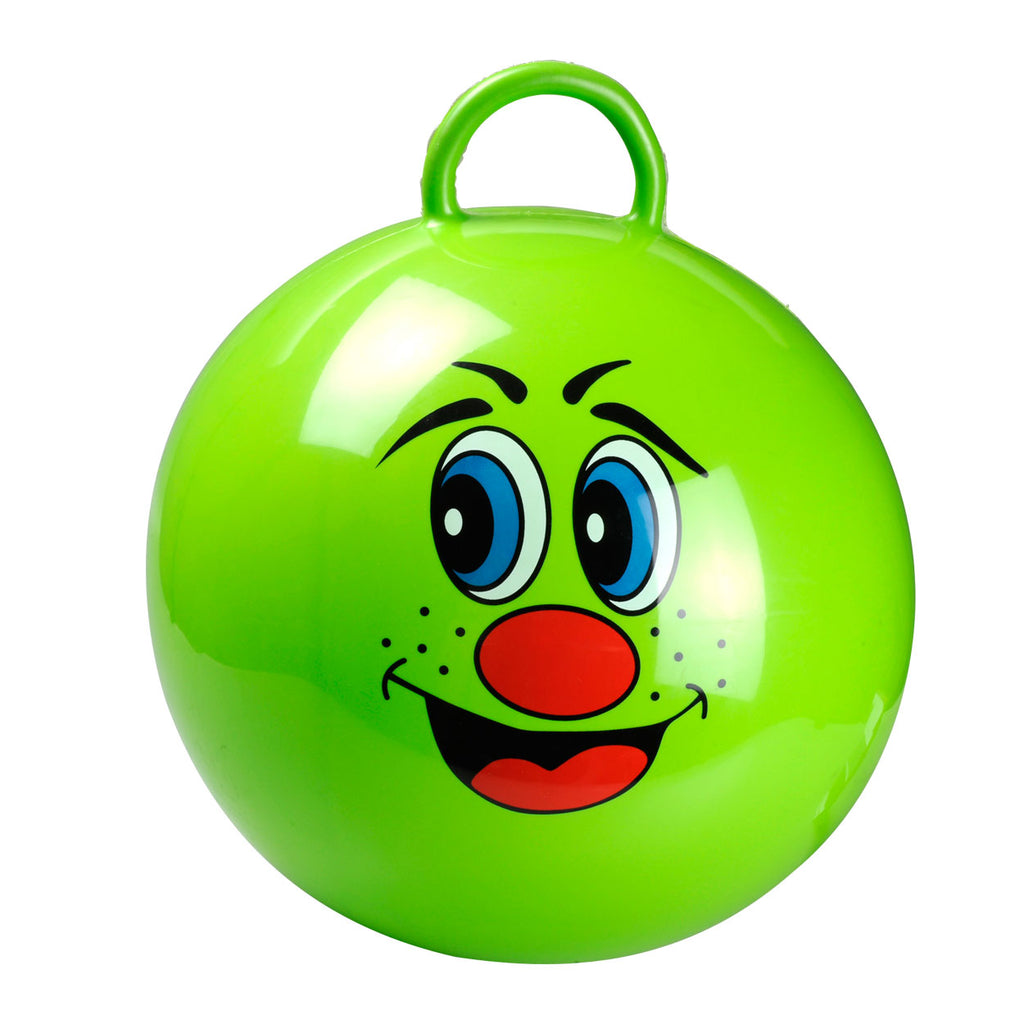 Grote groene skippybal met vrolijk lachgezicht. De bal is eenvoudig op te blazen met een voetpomp.