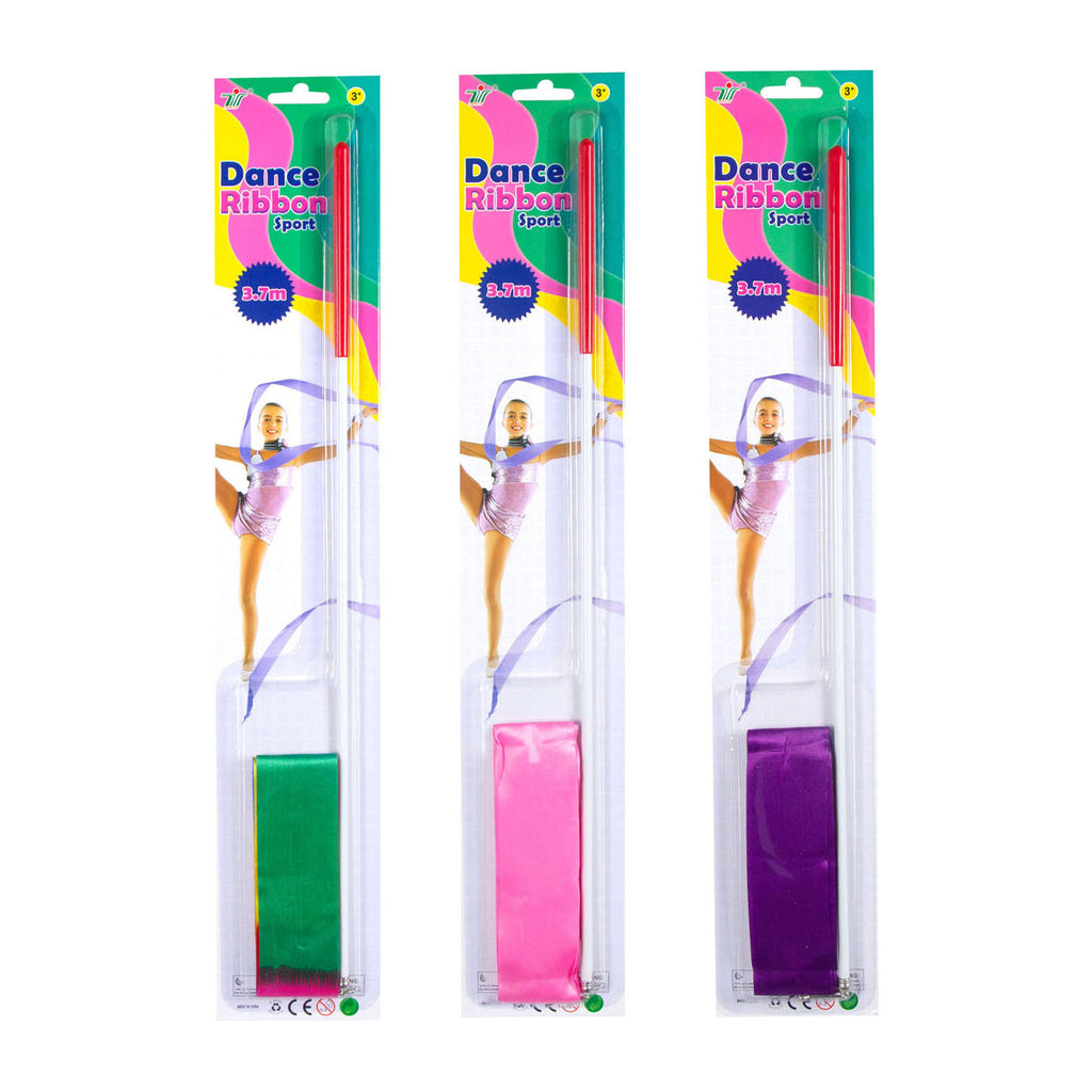 Danslint aan een kunststof stok. Lengte lint: 3,7 meter. Verkrijgbaar in de kleuren roze, paars en regenboog. Geschikt voor kinderen vanaf 3 jaar.