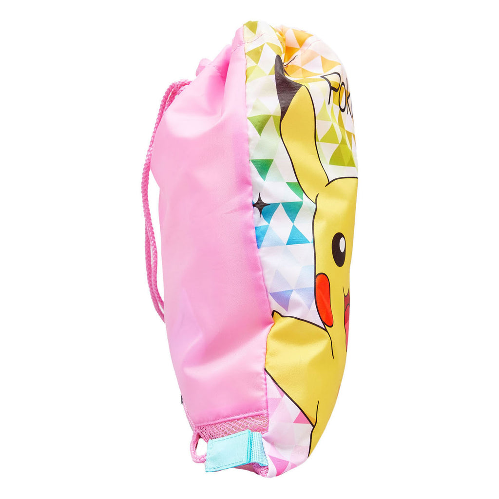 Roze Pokémon gymtas met vrolijke print van Pikachu. De gymtas heeft schouderbanden van touwtjes en is 42 x 30 centimeter groot. Gemaakt van polyester.