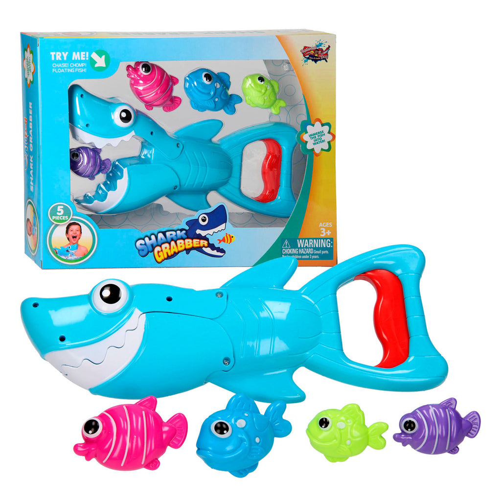 De haaienhapper is een leuk spelletje voor in bad. Laat de vier visjes los en besluip ze daarna met de haai… Knijp in het handvat en HAP! Het visje verdwijnt in de bek van de haai! Inclusief vier visjes en de haai met handvat. Alle onderdelen zijn gemaakt van kunststof.