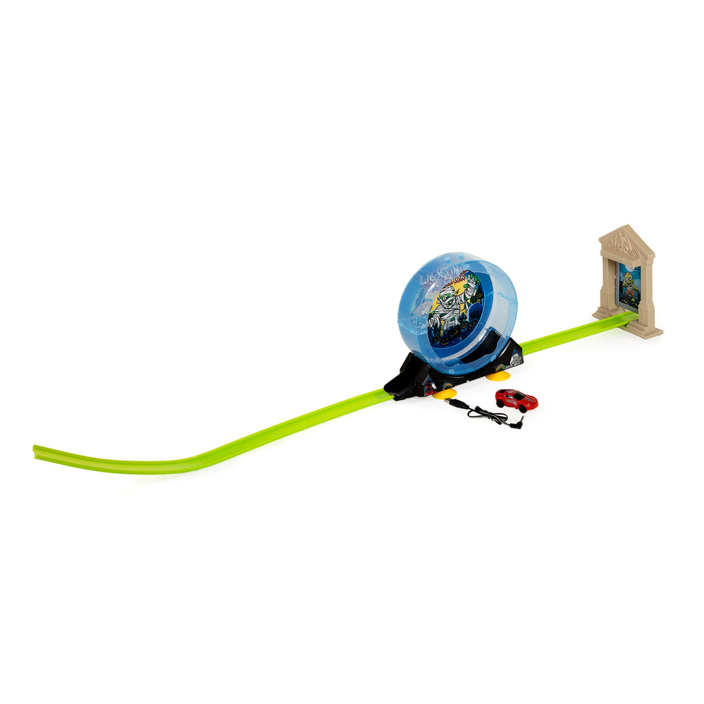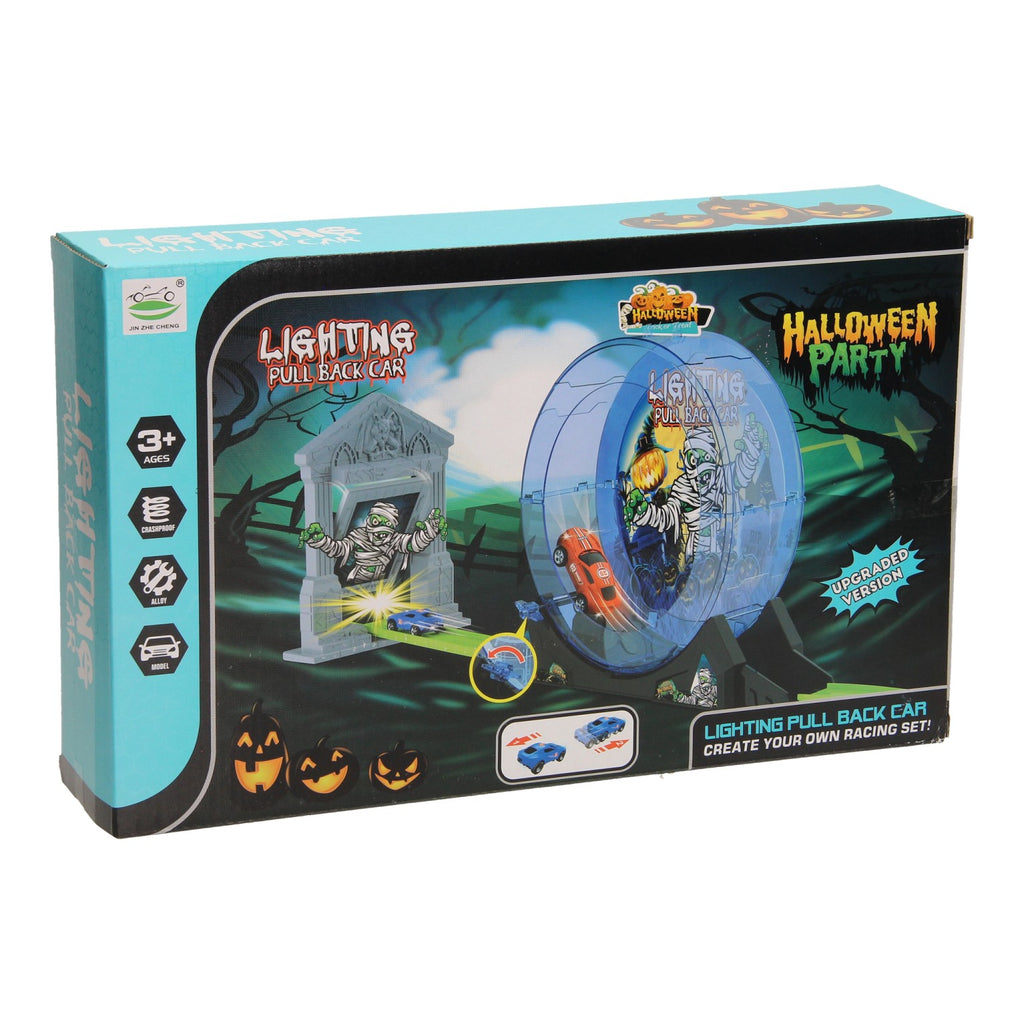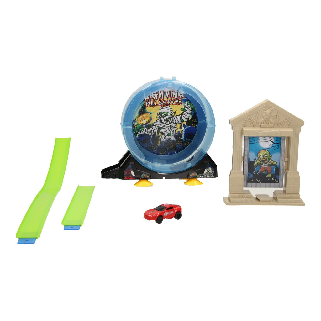 Afschiet Racebaan. Inclusief één kunststof raceauto met pullback functie. Geschikt vanaf 3 jaar.