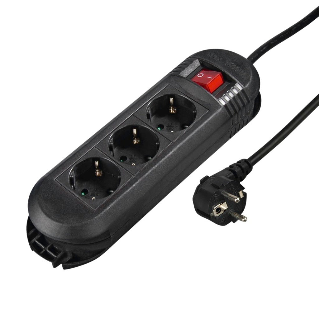 - Stekkerdoos van hittebestendige kunststof, stekkerdooscontacten 45° gedraaid, met tweepolige, verlichte veiligheidsschakelaar en praktische kabelhouder