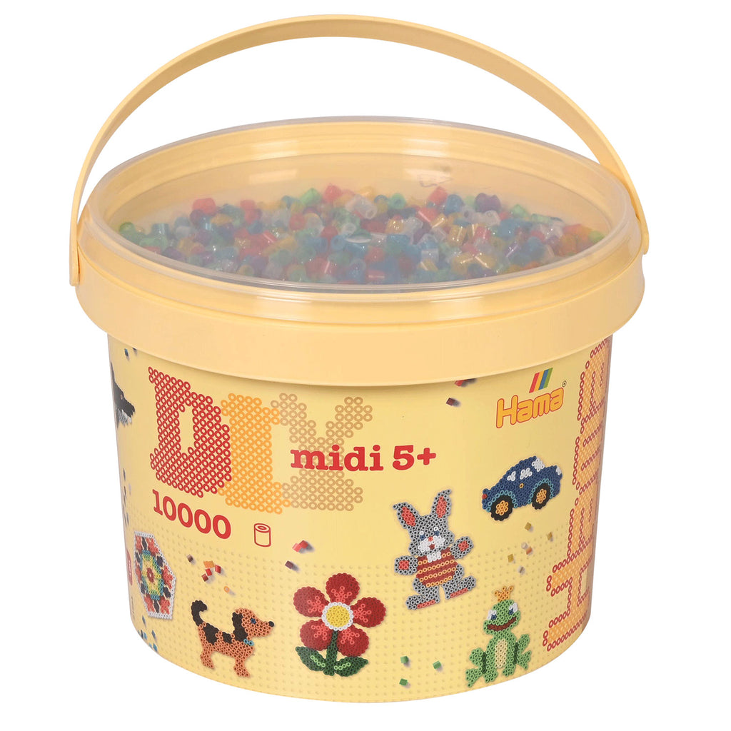 Emmer met 10.000 Hama Midi transparante strijkkralen in verschillende kleuren (No. 13, 14, 15, 16, 19, 24 met glitter). Geschikt voor kinderen vanaf 5 jaar oud,.
