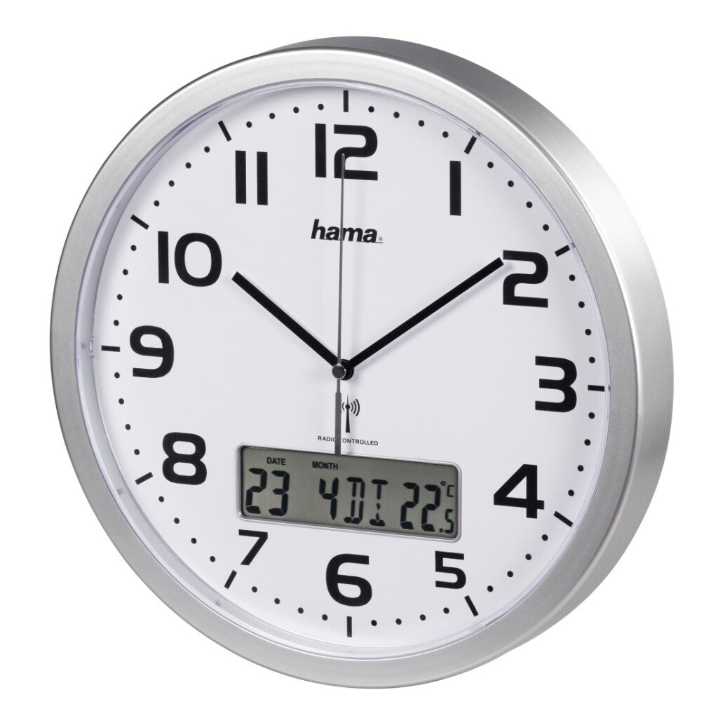 - Radiogestuurde klok met analoge tijdsaanduiding en digitale kalenderweergave en temperatuurweergave
