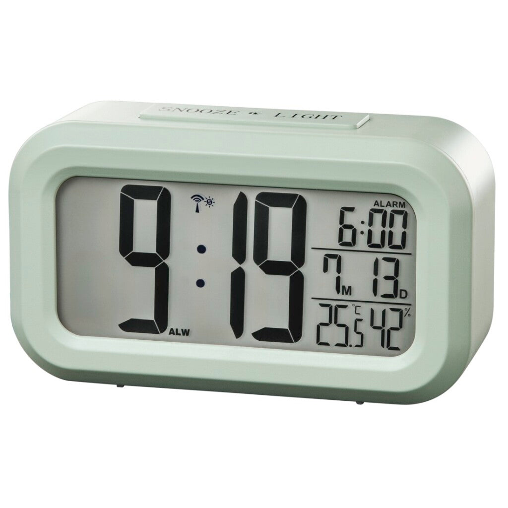 - Radiogestuurde DCF-klok met digitale weergave van tijd, wektijd, datum, temperatuur en luchtvochtigheid