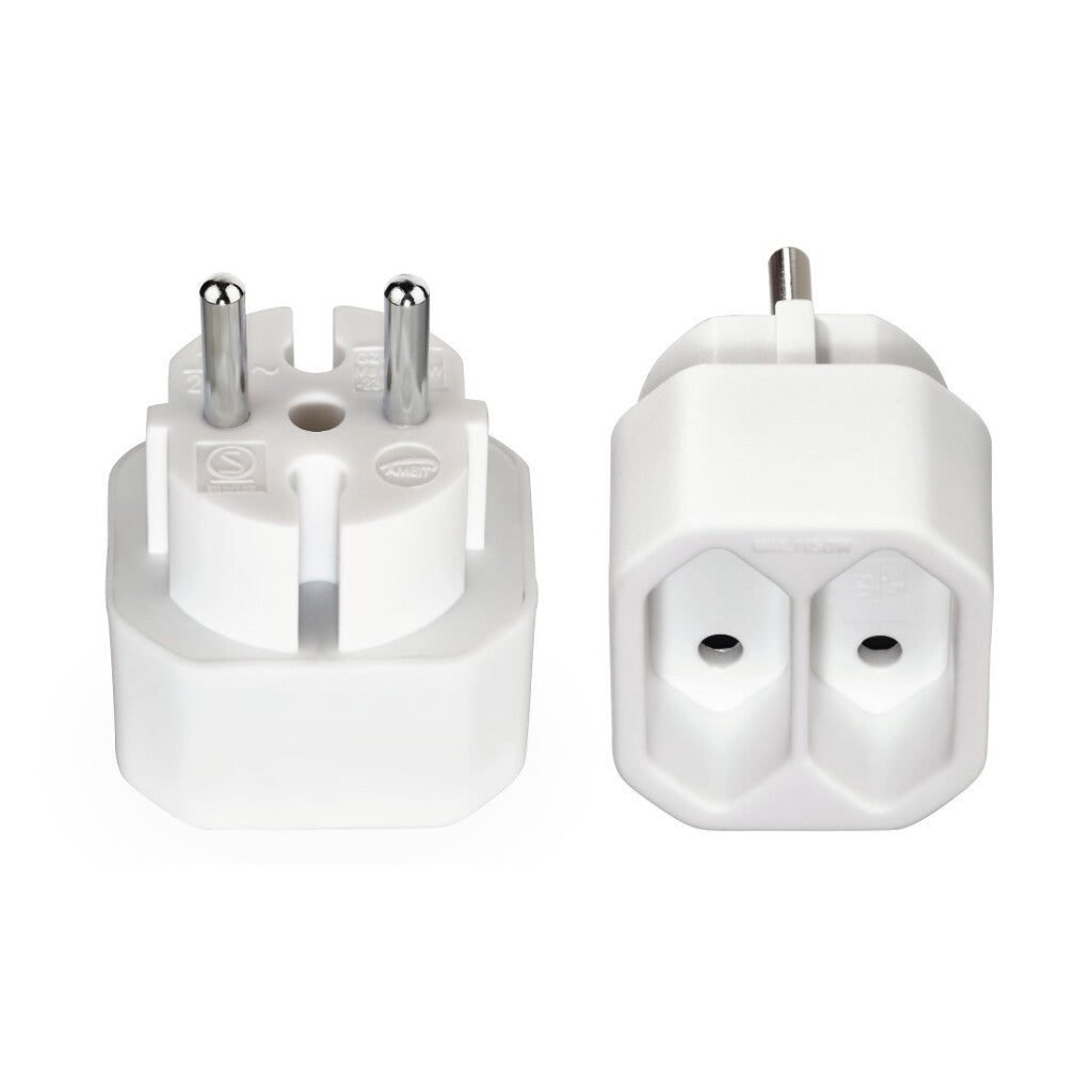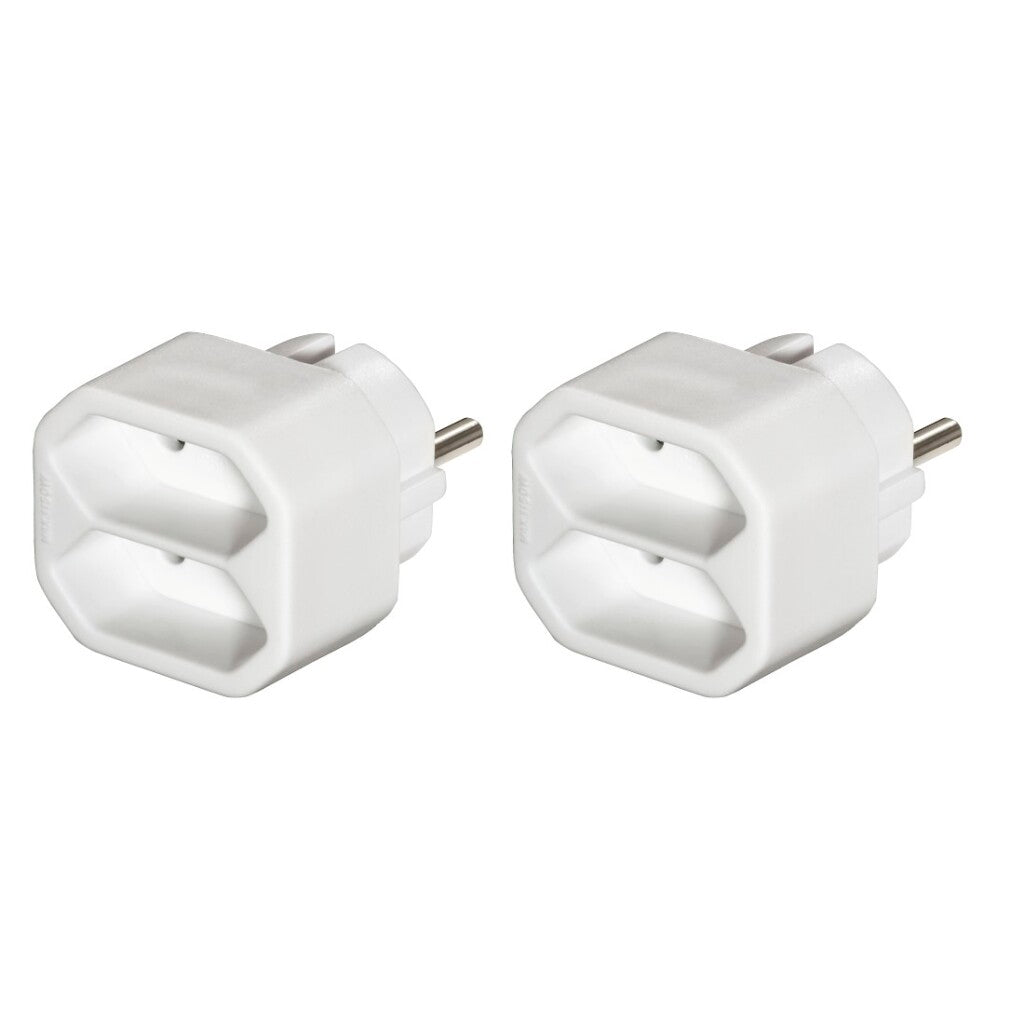 - Compacte adapter verandert één geaard stopcontact in twee euro-stopcontacten