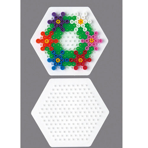 Strijkkralen kun je in bijna elk gewenst patroon leggen en dan door middel van strijkpapier en een strijkijzer samensmelten. Maar daarvoor heb je natuurlijk wel een grondplaat nodig.Zeshoekige kleine grondplaat.