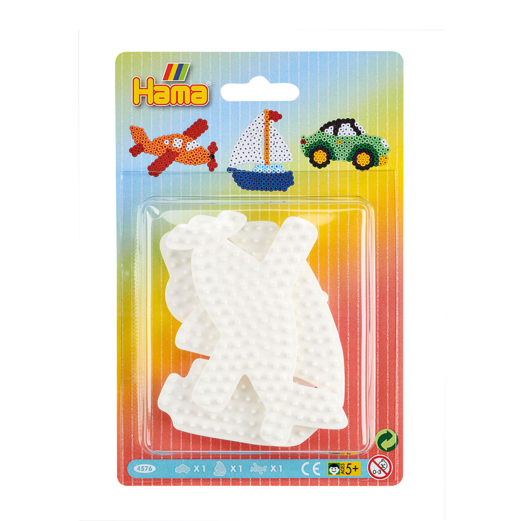 Hama strijkkralenbordjes in de vorm van een auto, zeilschip en een vliegtuig.