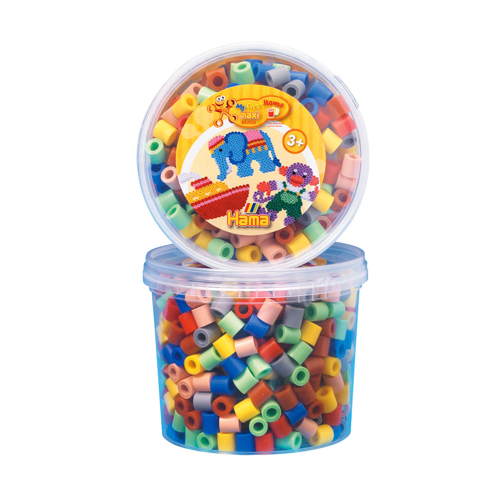 Bak met 600 Hama Maxi strijkkralen in 7 verschillende kleuren. Kleurnummers: 03, 05, 09, 17, 20, 26, 47.