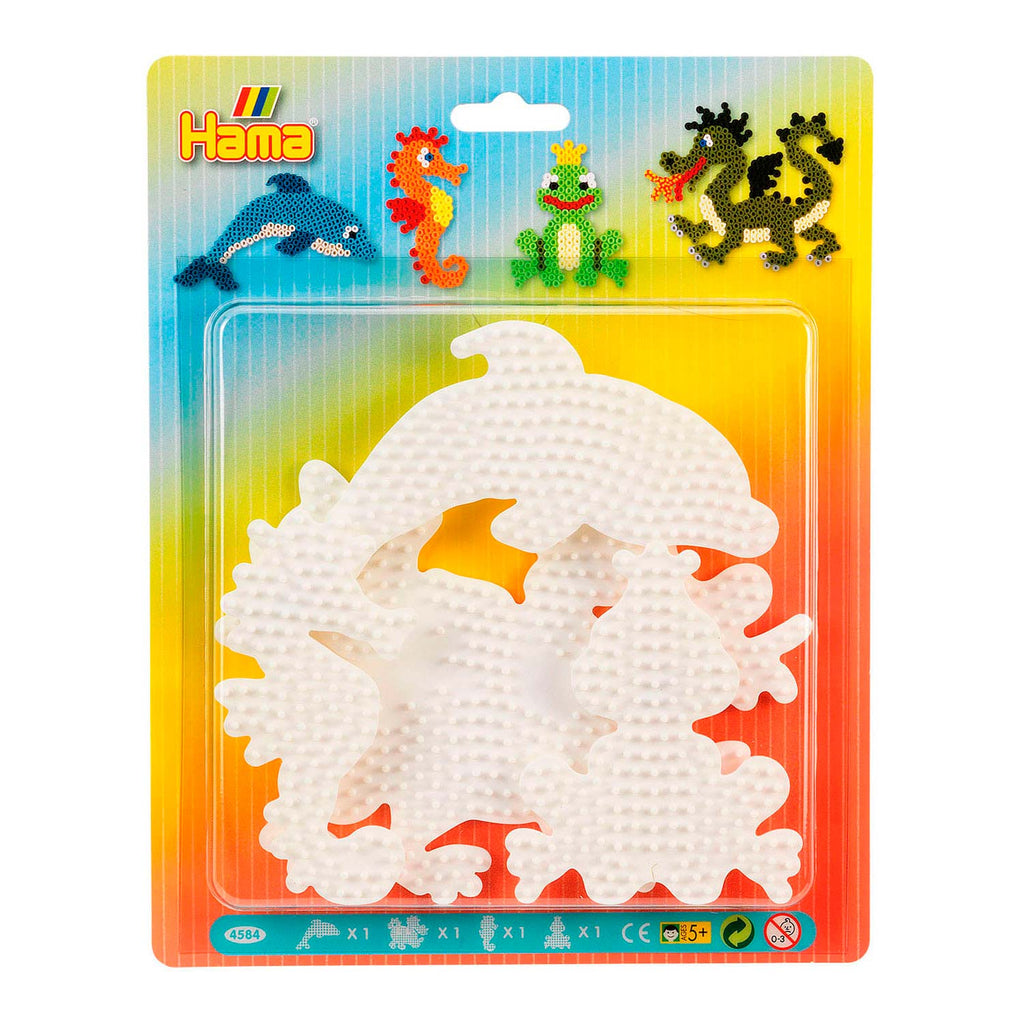 Hama strijkkralenbordje in de vorm van een dolfijn, draak, paard en een kikker. Exclusief strijkkralen.