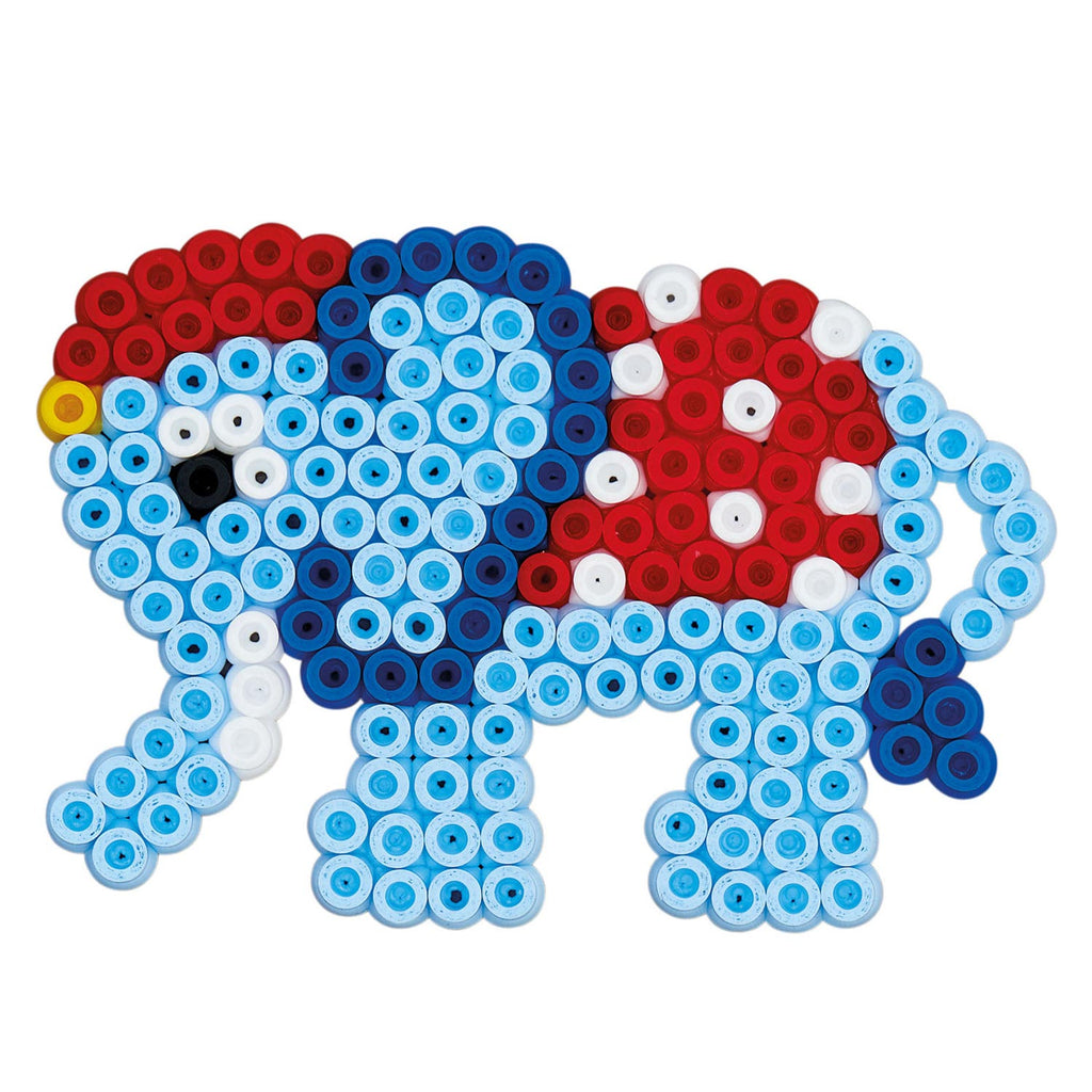 Pot met met 15000 Hama strijkkralen in verschillende kleuren, compleet met 3 verschillende strijkkralenbordjes in de vorm van een vierkant, een dinosaurus en een olifant.