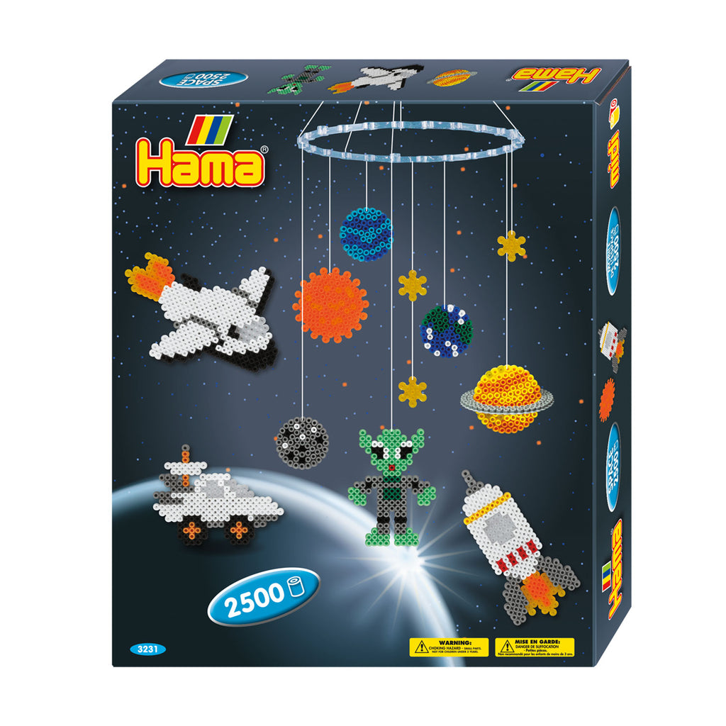 Complete Hama strijkkralenset om een ruimtevaart mobile te maken. Inhoud: 2500 strijkkralen, groot vierkant strijkkralenbordje, rond strijkkralenbordje, 1 mobile ring, draad, strijkpapier, instructies en verschillende voorbeelden.