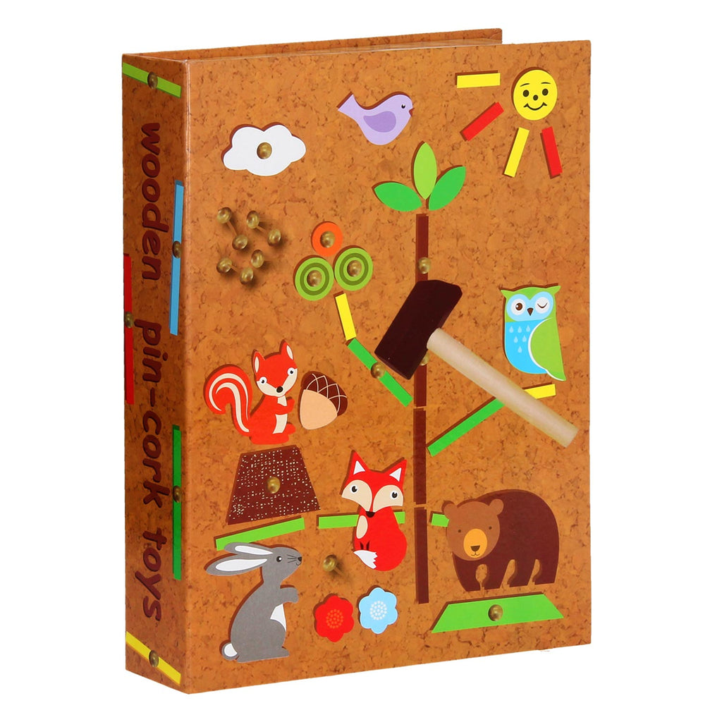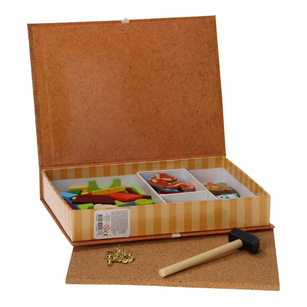 Hamer, spijker en tik er vrolijk op los met dit houten Hamertje Tik Bosdieren. Gebruik je creativiteit of de voorbeeldjes om de leukste kunstwerkjes te maken met deze mooie houten bosdiertjes en hun attributen. Inclusief hamer, legbord, 8 voorbeelden, 80 spijkers en 80 vormpjes.