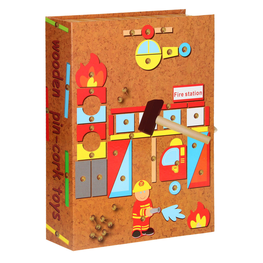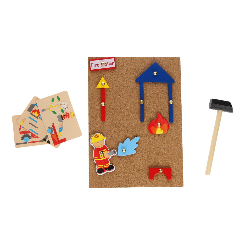 Hamer, spijker en tik er vrolijk op los met dit houten Hamertje Tik Brandweer. Gebruik je creativiteit of de voorbeeldjes om de leukste kunstwerkjes te maken. De brandweerlieden in hun brandweerwagen of in de brandweerkazerne of redden ze vandaag de poes in nood? Jij bedenkt het! Inclusief hamer, legbord, 8 verschillende figuurtjes en voorwerpen, 8 voorbeelden, 80 spijkers en 78 gekleurde vormpjes.