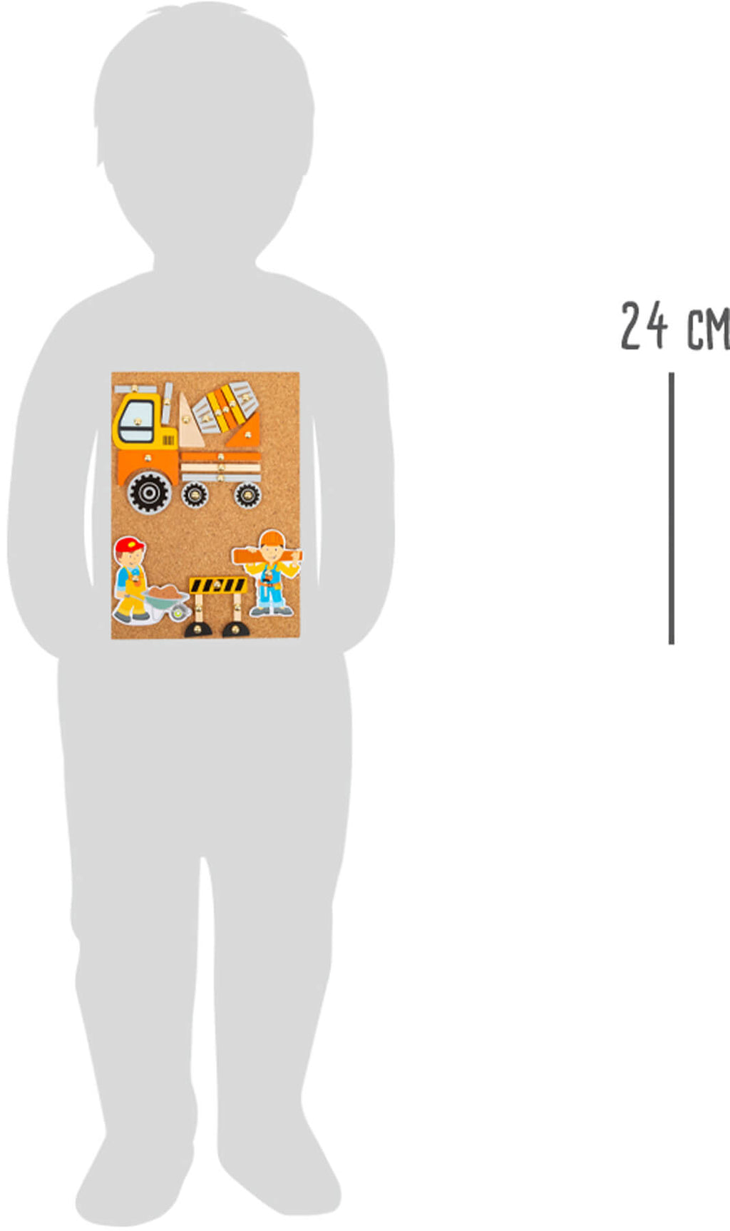 Uitgerust met een kurkbord, een hamer, spijkers en diverse houten elementen kunnen kinderen met dit hamerspel allerlei bouwplaatsmotieven maken. Of het nu gaat om de bouwvakker, de cementmolen, de kraan of de graafmachine, deze set bevat alles wat nodig is om allerlei bouwplaatsfoto's uit te hameren. Met 8 fotosjablonen en opbergdoos! Dit behendigheidsspel bevordert de ontwikkeling van creativiteit en geeft kinderen de ruimte om eigen creaties en afbeeldingen te maken. En omdat hij in een praktische doos is verpakt, gaat er niets verloren.
