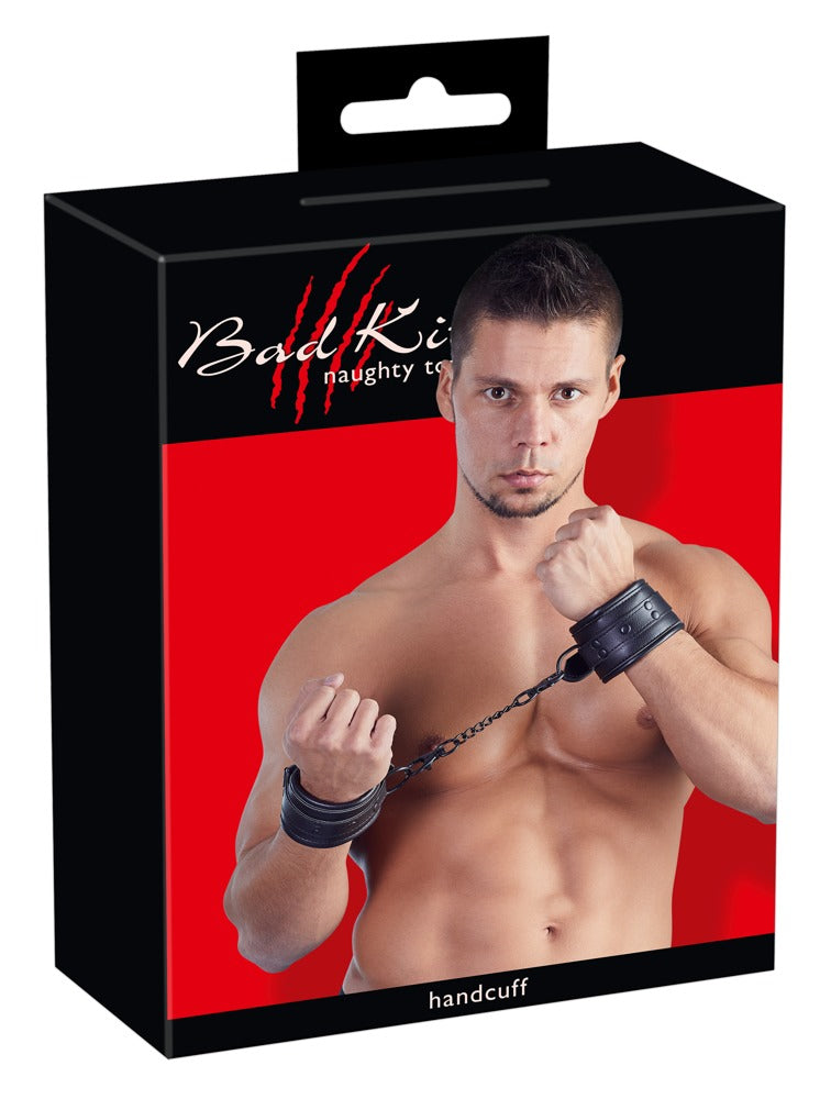 Softly padded handcuffs (circumference 18-28 cm) with buckle fasteners. The handcuffs are made out of imitation leather. There are short metal chains (complete length 16 cm) with snap hooks for joining the handcuffs together. Chain, buckles and studs are covered in matte varnish. Black. PU, metal.