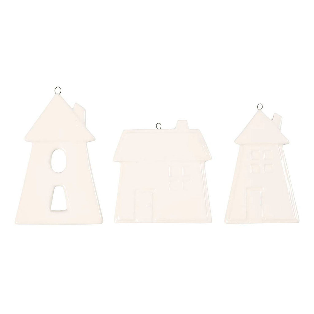 Geglazuurde ornamenten om op te hangen met klein oog van metaal. Set met 3 verschillende designs