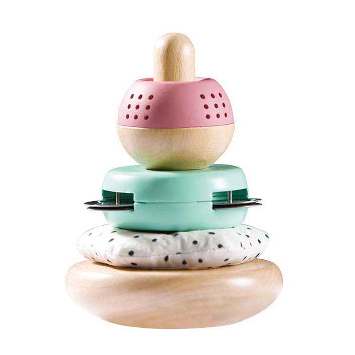 Deze leuke wiebelende stapeltoren is een geweldige zintuiglijke ervaring voor uw kleintjes. Met een ster met een gekreukelde textuur, een rinkelende minitamboerijn en een rammelende kralenbal om op de wiebelende basis te stapelen!