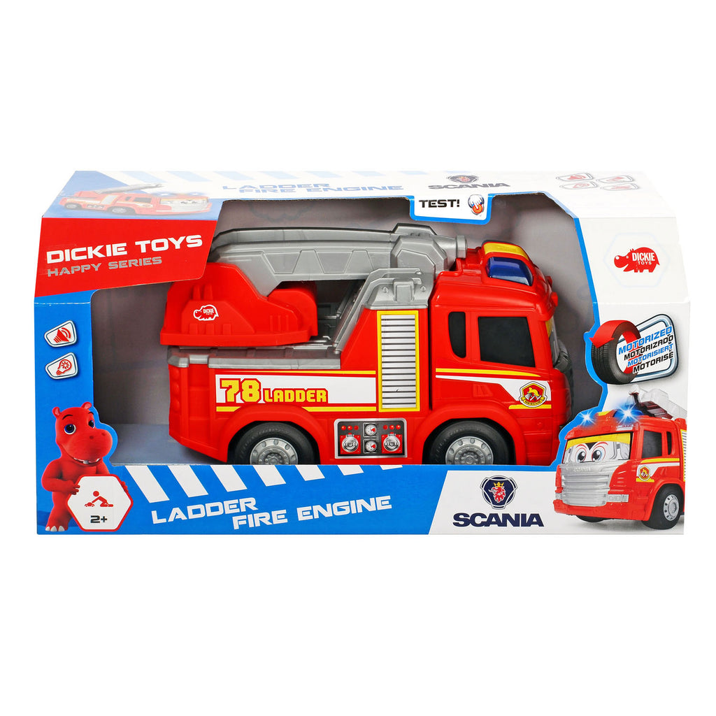 Druk op de knop en de Happy Brandweerwagen komt in actie: de speelgoedauto rijdt vooruit, de lampen gaan knipperen en de sirene begint te loeien. De brandweerauto is voorzien van verschillende geluiden. Ook kun je de brandweerladder omhoog, omlaag en ronddraaien. De Happy Brandweerwagen werkt op 3 AA batterijen (inbegrepen). Lengte: 29 centimeter.