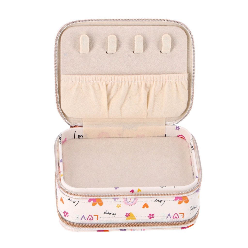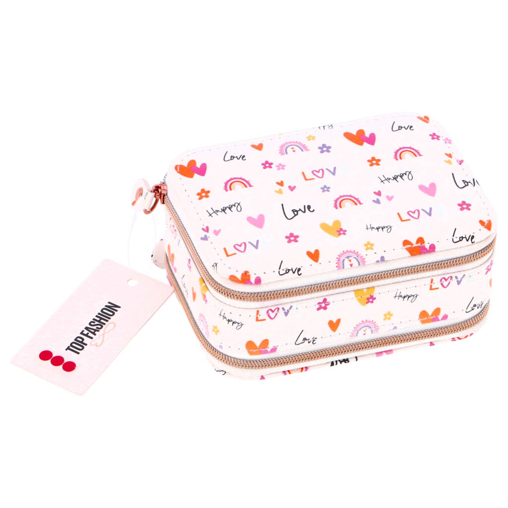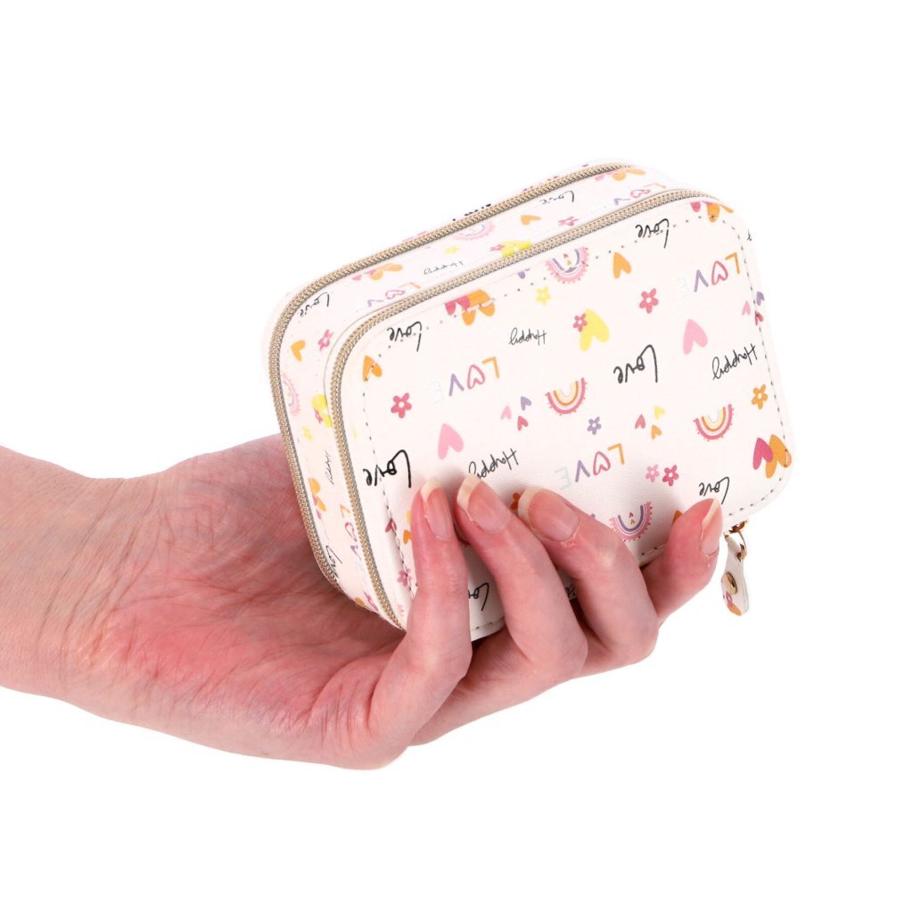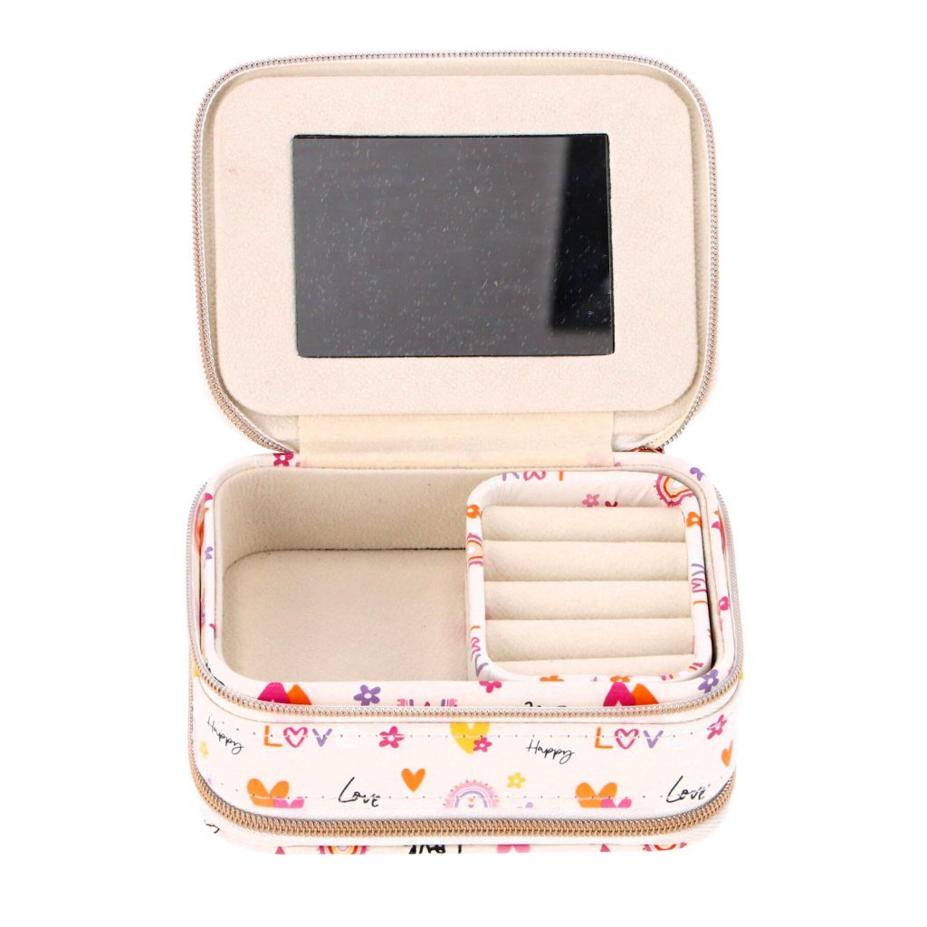 Houd jouw kostbare sieraden veilig en georganiseerd in onze Happy Love sieradendoos! Deze betoverende sieradendoos is ontworpen om een glimlach op je gezicht te toveren elke keer dat je hem opent. Met twee handige vakken en slimme opbergmogelijkheden, is het de perfecte metgezel voor jouw waardevolle sieraden. Het eerste vakje biedt voldoende ruimte voor je favoriete ringen, terwijl het bijgeleverde bakje ervoor zorgt dat je ringen niet in de war raken en gemakkelijk te vinden zijn. De haakjes in het tweede vakje zijn ideaal voor het ophangen van armbanden, waardoor ze netjes en georganiseerd blijven en klaar zijn om gedragen te worden. Maar dat is nog niet alles! Onze Happy Love sieradendoos heeft ook een ingebouwd spiegeltje, waardoor je je sieraden meteen kunt bewonderen wanneer je de doos opent. Of je nu een ketting om wilt doen, je oorbellen perfect wilt matchen of gewoon wilt glimlachen naar jezelf, deze handige spiegel is een echte toevoeging. Het sieradendoosje heeft een compact formaat van 11,5 x 9,5 x 5,5 cm.