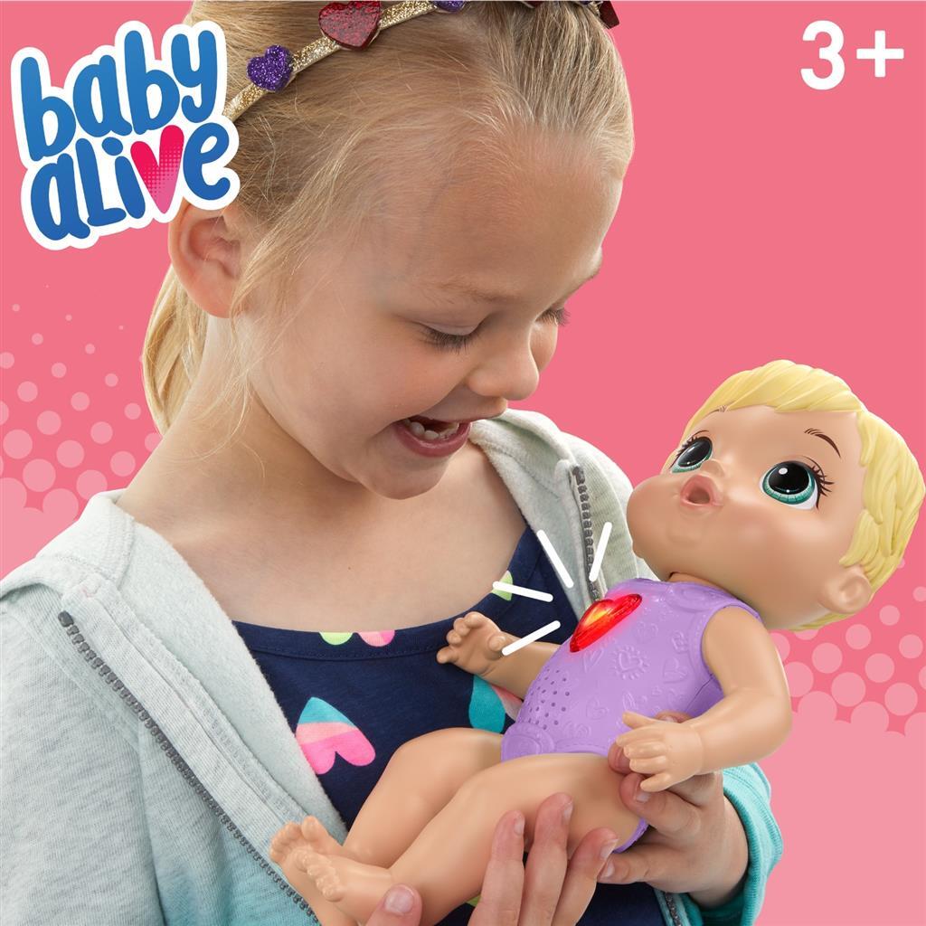 Baby Alive Happy Heartbeats Babypop reageert op spelen! Pak haar op en ze maakt leuke giechelgeluiden terwijl haar hartslaglampje knippert om je te laten zien dat ze opgewonden is! Ze weet ook wanneer het dutje is. Wieg de baby in slaap en ze reageert met zoete slaperige geluiden als haar hartslaglampjes laten zien dat ze afdrijft naar dromenland. Zorg ervoor dat je haar instopt met haar berendekenaccessoire terwijl ze slaapt. Wanneer je de baby uit haar dutje haalt, zal ze enthousiast zijn om weer helemaal opnieuw te spelen! Met meer dan 10 babygeluiden, een leuk knipperend hartslaglampje en een schattig berendekentje om in te knuffelen, is het een geweldig interactief babypopspeelgoed. Afmeting ca. 25 cm. Geschikt voor kinderen vanaf 3 jaar.
