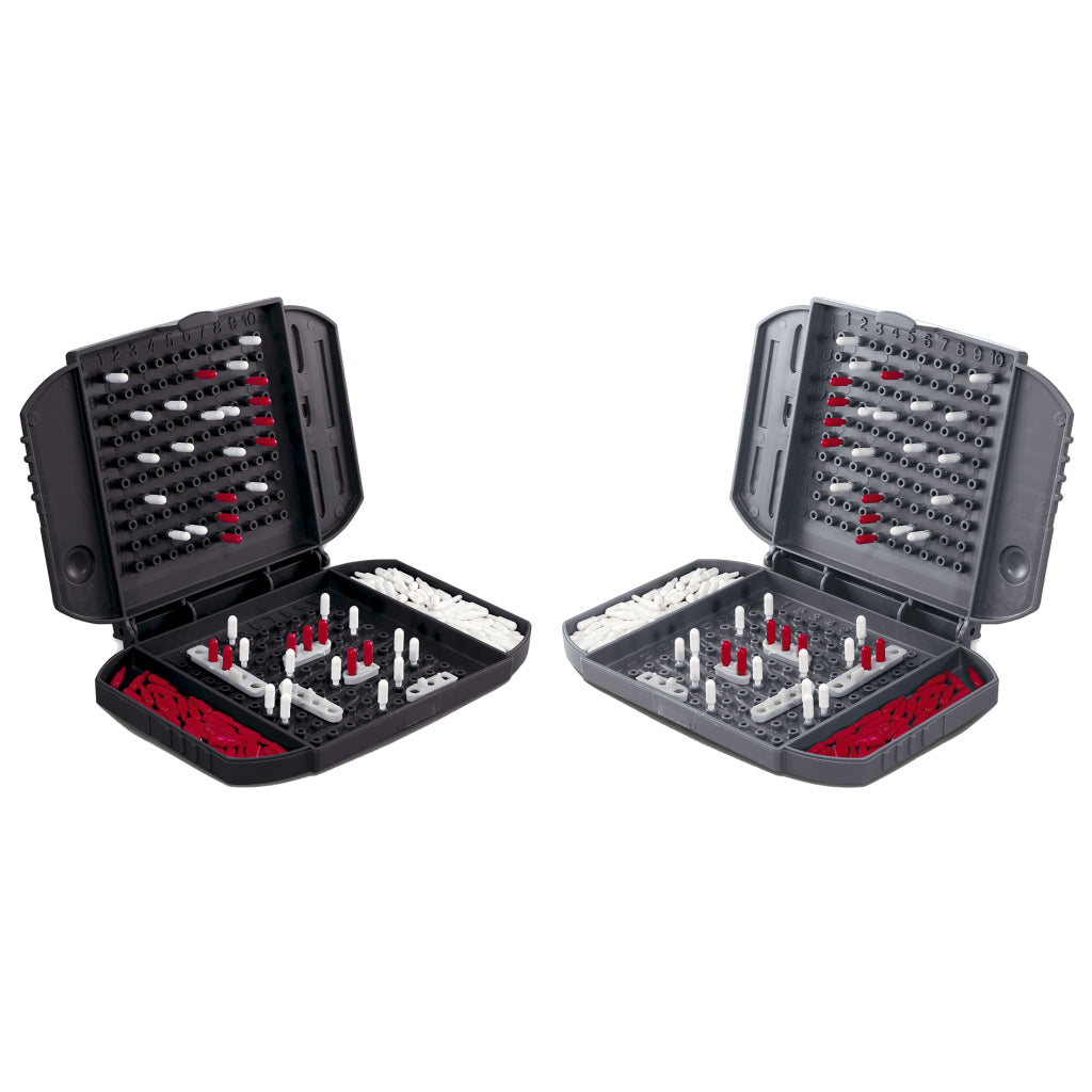 Leid je vloot ook onderweg naar de overwinning met dit compacte Zeeslag spel! Kun jij de vloot van je tegenstander tot zinken brengen voordat hij de jouwe naar de haaien stuurt? Jij bepaalt de strijd met je handige spelcassette. Plaats je vliegdekschip, slagschip, kruiser, onderzeeër en mijnenveger op het oceaanraster. Als de strijd voorbij is, berg je de pinnetjes en de schepen op inde cassettes en je schuift ze in elkaar. Plan je strategie en leid je troepen naar de overwinning!
