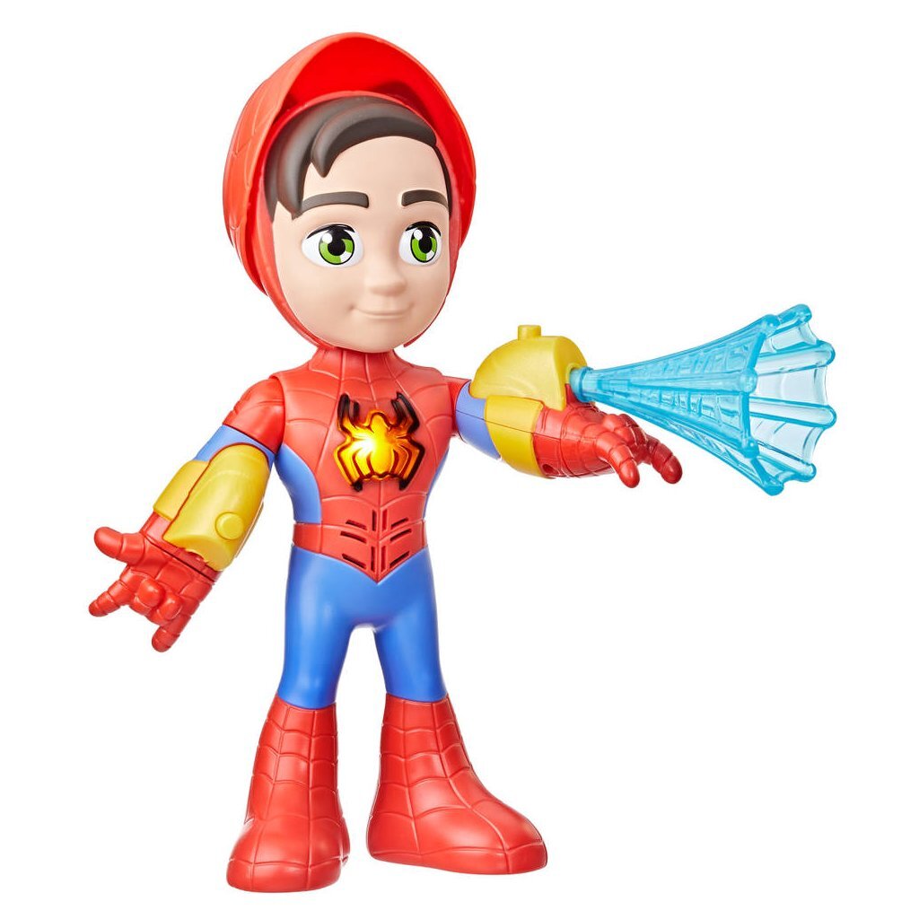 HetHasbro Spidey and Friens figuur is een superheldenspeeltje waar kinderen geen genoeg van kunnen krijgen! Dit grote actiefiguur van 10 inch (25,4 cm) is gemakkelijk vast te houden tijdens het spelen, kan rechtop staan om te pronken of dient als een maatje van de Marvel-held om samen Disney Junior's Spidey and His Amazing Friends te kijken! Spidey heeft een masker dat kinderen kunnen opklappen om het gezicht van Peter Parker te onthullen, geluiden en zinnen uit de show en een icoon op de borst van Spidey dat oplicht. Dit Spidey and Friends speelgoed bevat ook 2 webprojectielaccessoires die kinderen kunnen afschieten vanaf een van de polsen van Spidey, voor nog meer fantasierijke interactie tijdens het spelen. De andere pols van Spidey heeft ook een webaccessoire met een draaifunctie! Stel je voor dat je slechteriken verslaat door het bijgeleverde staande Green Goblin-doelwit op te zetten voor web-blast plezier! Marvel's Spidey and His Amazing Friends speelgoed is een geweldig cadeau voor jongens en meisjes vanaf 3 jaar, en voor elke gelegenheid.