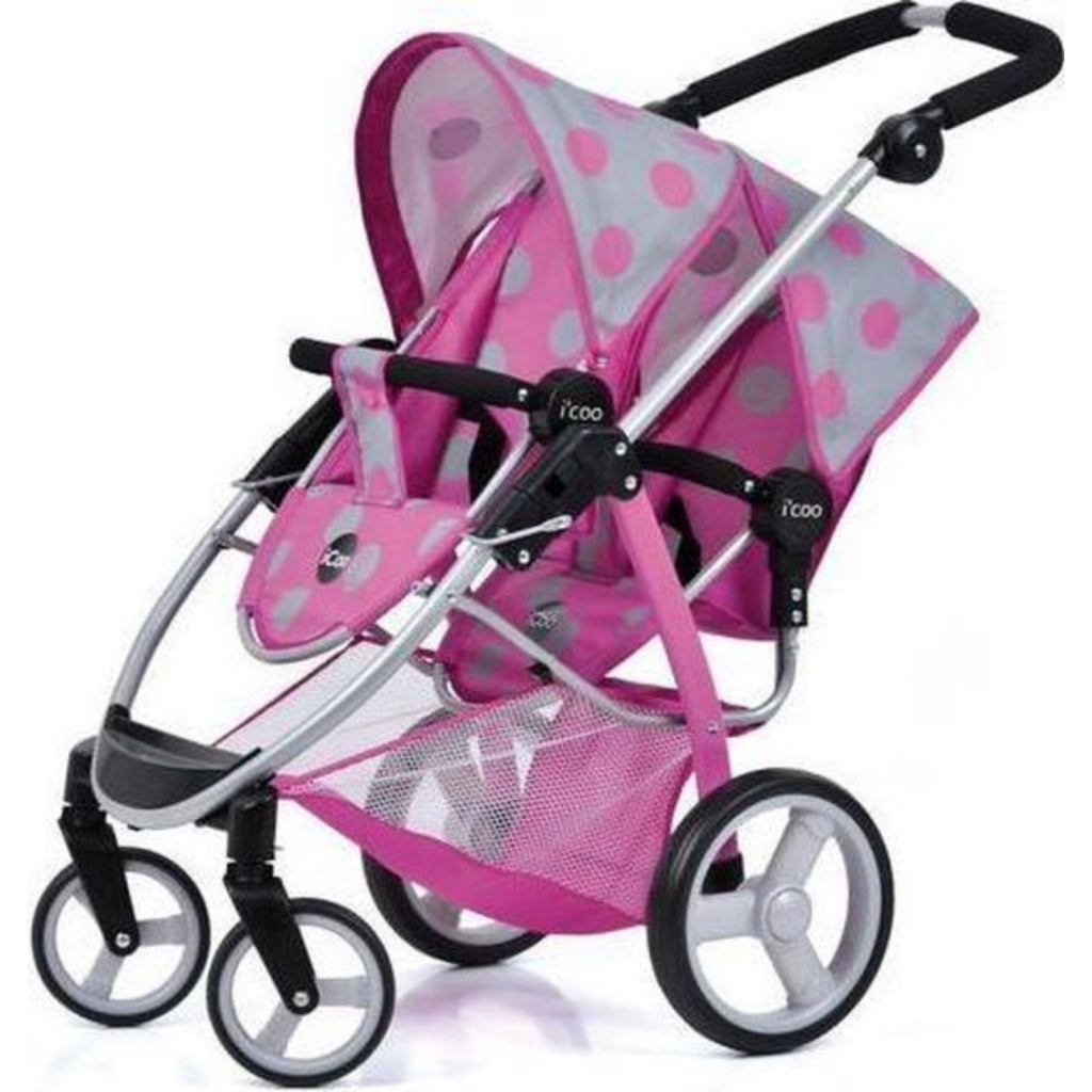Hauck-Toys iCoo Duett poppenwagen voor 2 poppen van ieder ongeveer 46 cm lang. Niet verstelbaar, maar kan worden opgevouwen. Met handig opbergvak. Kleur: roze/grijs.