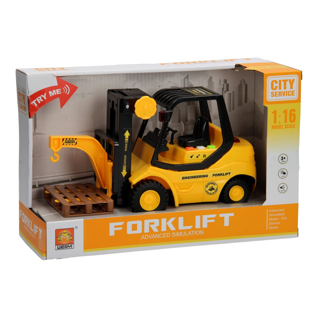Met een heftruck til je dingen op die anders niet te tillen zijn. Met de draaiknop aan de zijkant kan je de kraan van de heftruck echt omhoog en omlaag draaien. De heftruck is gemaakt van stevig kunststof en heeft rubberen banden. Wanneer je op de knoppen drukt naast de stoel van de heftruck gaan de lichten branden en maakt de heftruck geluid. De heftruck is gemaakt op een modelschaal van 1:16. Werkt op 3 knoopcelbatterijen (batterijen zijn inbegrepen).