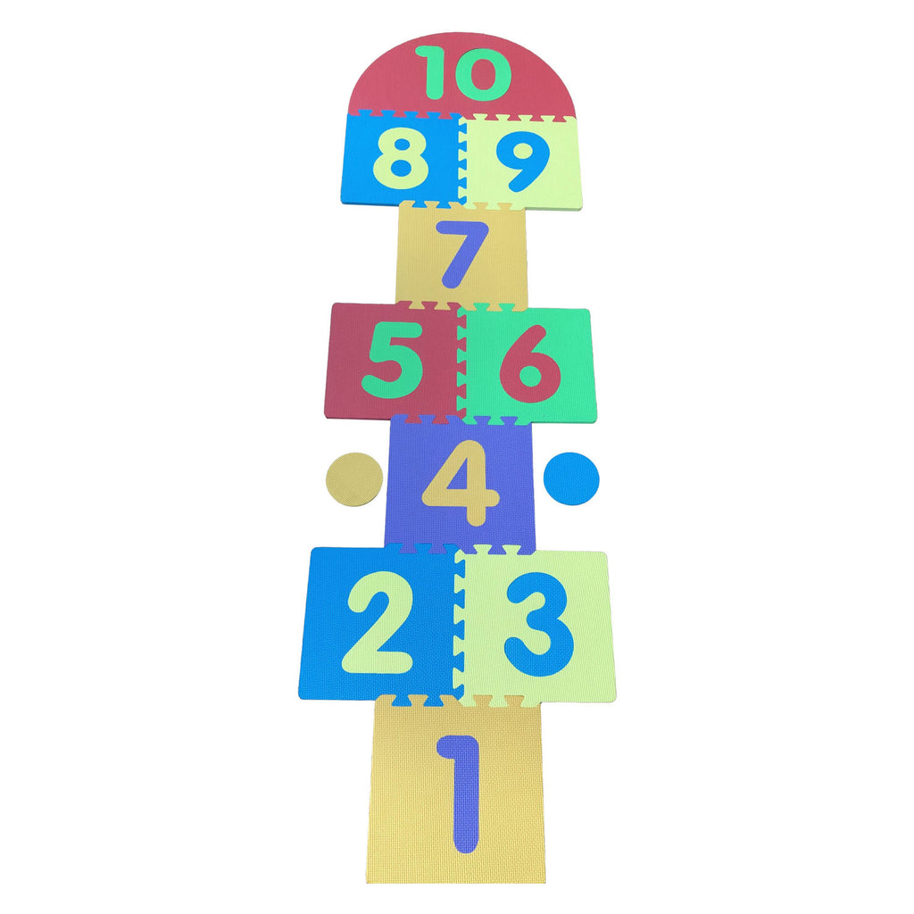 Hinkelmat van foam met 12 tegels, waarvan 10 vierkante tegels met de cijfers 1 tot en met 10. De tegels zijn als een puzzel aan elkaar te bevestigen en daardoor is de hinkelbaan naar eigen wens op te bouwen.