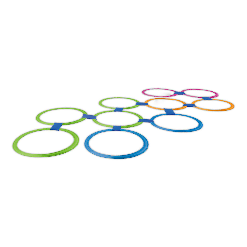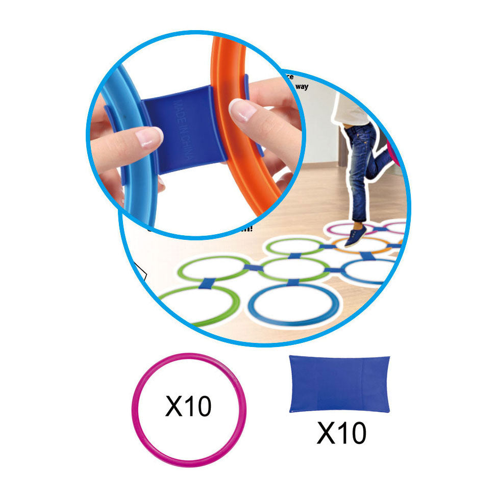 Set met hinkelringen. Inhoud: 10 ringen met een diameter van 27 centimeter en 10 verbindingsstukken.