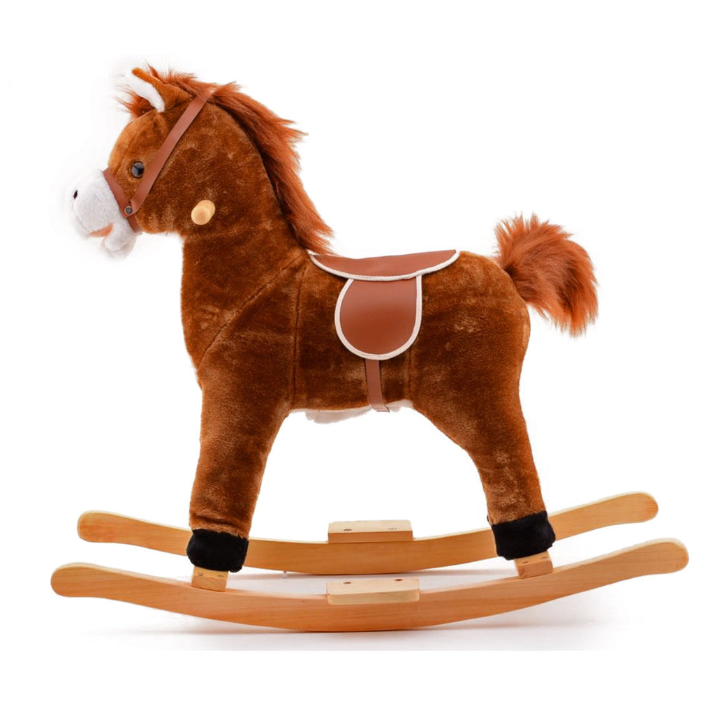 Met dit mooie pluche hobbelpaard kun je uren plezier beleven. Als je in z'n oren knijpt maakt hij echt geluid en waggelt hij met z'n staart. Het paard heeft een hoogte van 64 cm en het maximale draaggewicht is 40 kg. Werkt op 3 AA batterijen (niet inbegrepen).