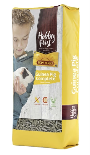 Hobbyfirst Hopefarms Guinea Pig Complete is volledig graanvrij voer voor cavia's van alle leeftijden in pelletvorm met een hoog vezel- en vitamine C-gehalte.