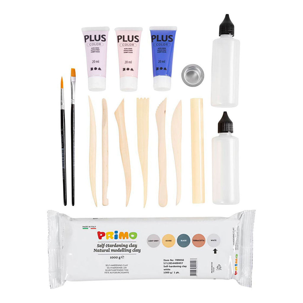 Met deze set kunt u vier unieke producten van zelfhardende klei maken ??? een kom, een kandelaar en twee vazen. De set bevat alle materialen en instructies die u nodig hebt.Als u er altijd al van droomde om zelf keramiek voor thuis te maken, dan is deze set echt ideaal. Hij bevat stapsgewijze instructies voor verschillende manieren om zelfhardende klei te gebruiken. U leert bijvoorbeeld een speciale techniek om een kandelaar en een vaas te maken, en hoe u een andere techniek gebruikt om een vaas of kom te maken..Inhoud: Klei, verf, penselen, boetseergereedschap, kaarshouder en plastic fles